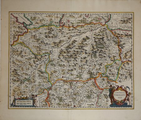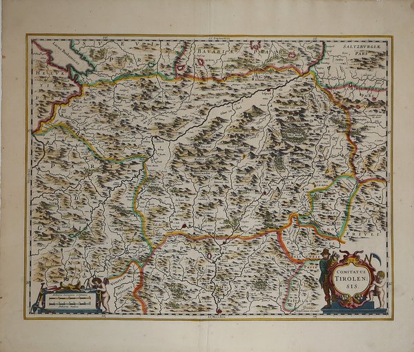 Carta geografica inserita nel Novus Atlas sive Theatrum Orbis Terrarum, pubblicato dal Janssonius nel 1641. Rispetto ai modelli precedenti e contemporanei, la carta non presenta originalità nei rilevamenti, mentre territorialmente si estende ai Tirolo di Nord e Sud, e del Trentino comprende solo la zona a Nord di Trento. Decorativo il grande cartiglio col titolo, con due figure ai lati a sostenerlo. Incisione in rame, coloritura coeva, in ottime condizioni. Carta geografica inserita nel Novus Atlas sive Theatrum Orbis Terrarum, pubblicato dal Janssonius nel 1641. Rispetto ai modelli precedenti e contemporanei, la carta non presenta originalità nei rilevamenti, mentre territorialmente si estende ai Tirolo di Nord e Sud, e del Trentino comprende solo la zona a Nord di Trento. Decorativo il grande cartiglio col titolo, con due figure ai lati a sostenerlo. Incisione in rame, coloritura coeva, in ottime condizioni. Cfr. G. Tomasi, Il Territorio Trentino-Tirolese nell'antica cartografia, sc. 29