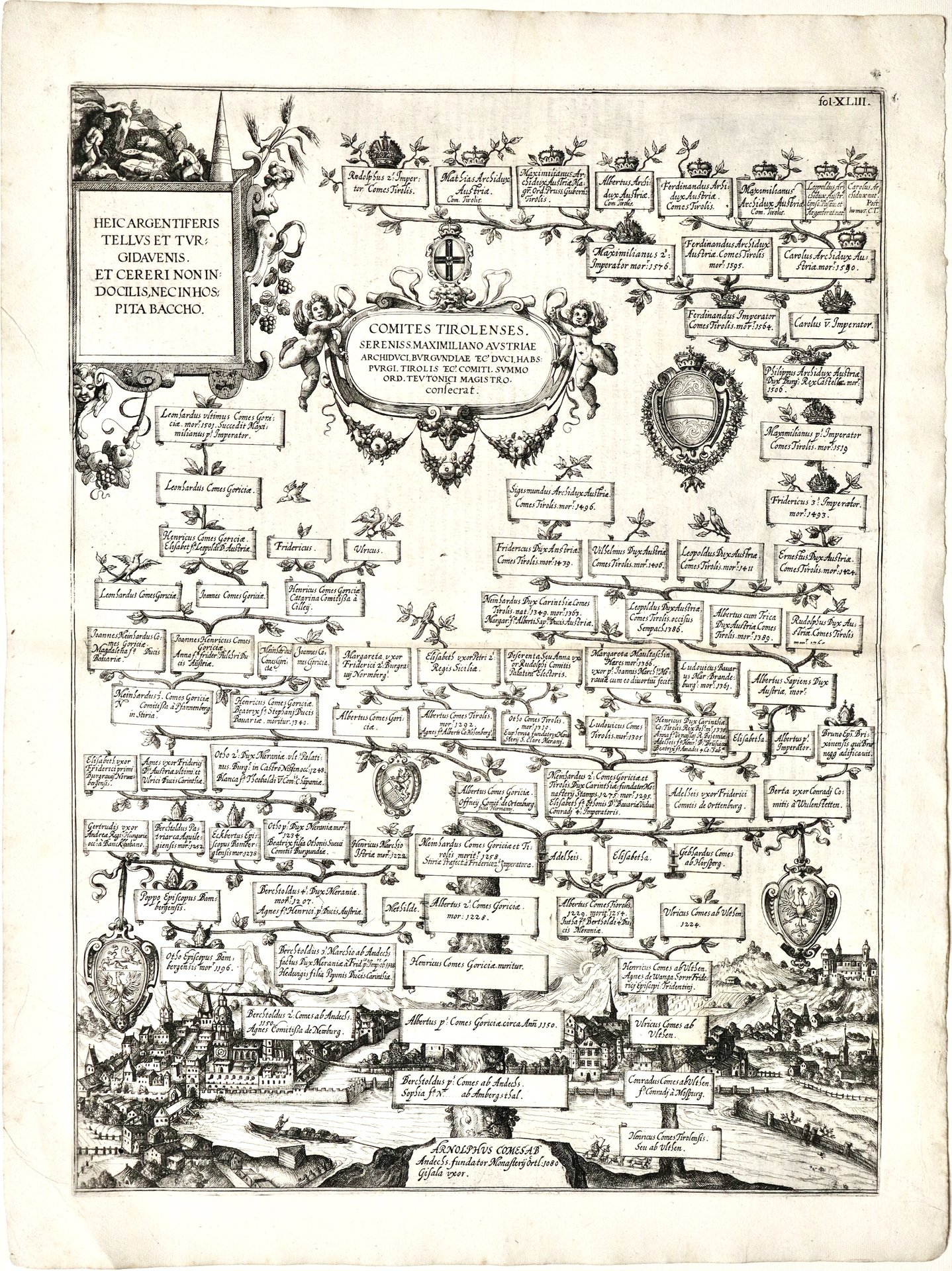 Incisione in rame di mm 535x390 tratta da "Principum Christianorum stemmata", contenente 46 tavole (23 a doppio foglio) che illustrano gli alberi genealogici delle casate regnanti in Europa, inseriti in un paesaggio che spesso raffigura la veduta realistica della capitale dello stato o riporta una carta geografica dello stesso, oltre a bandiere, stemmi e ricchi cartigli. L'opera, molto nota per la ricchezza ed eleganza delle tavole, è una delle più ricercate di genealogia araldica. Ottimo esemplare con Bressanone sullo sfondo. Leggero ingiallimento lungo la piega centrale.
