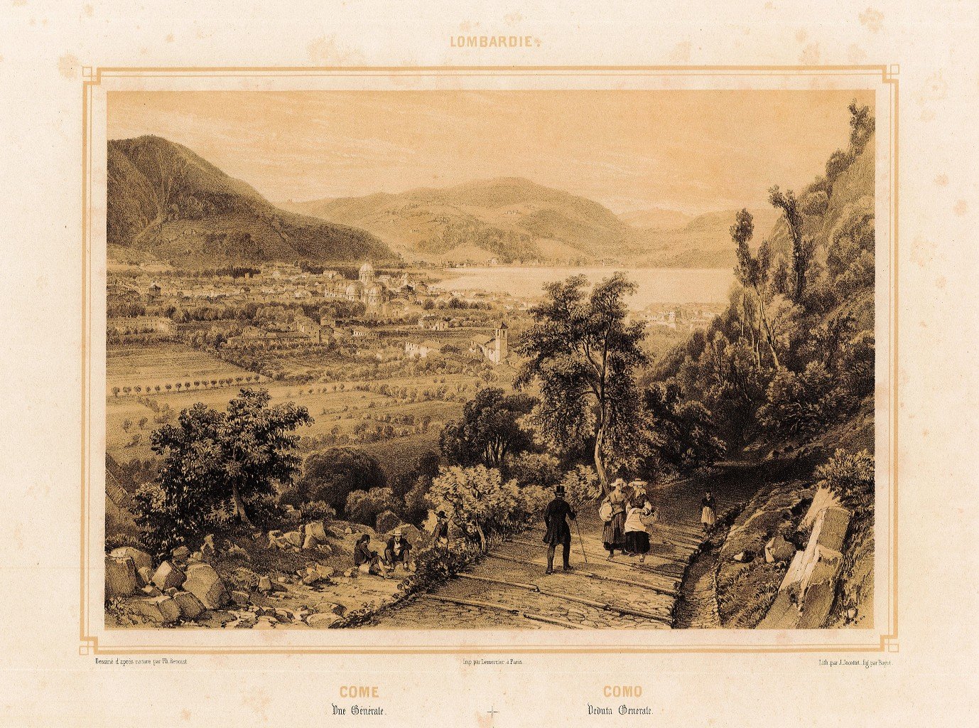Veduta della città di Como ripresa dalla strade che sale verso Brunate. Il particolare punto di presa permette di conoscere la struttura della città che si sviluppava alle spalle del Duomo. In lontananza si notano gli edifici del quartiere di Borgo Vico ed il profilo di Villa Olmo.Incisione stampata su fondo seppia, racchiusa entro semplice cornice a doppio filetto. Leggere macchioline che non comprometto l'ottimo stato di conservazione generale.
