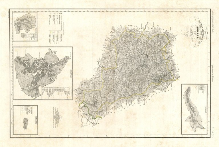 Carta geografica, antica ed originale, con rappresentazione del Compartimento senese con tre riquadri in calce: topografie di Montalcino, Siena e Pienza. Inserita nel I volume dell'opera "Atlante Geografico degli Stati Italiani delineato sopra le migliori e più moderne mappe per servire di corredo alla Corografia Fisica Storica e Statistica dell'Italia" contenente le carte dell'Italia Superiore. Descritta da Attilio Zuccagni-Orlandini, edita e stampata a Firenze nel 1844-45. Autore: Zuccagni - Orlandini edit. & G.Maina e V.Stanghi inc. Luogo: Siena - Montalcino - Pienza. Anno: 1844. Tecnica: incisione in rame. Dimensioni: 519x336 mm. L'incisione è caratterizzata da una coloritura coeva ai confini