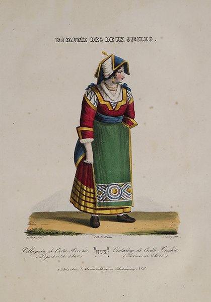 Litografia originale di Levilly su disegno di Sgroppo (mm 365 x 275) tratta dalla rara raccolta "Royaume des Deux Siciles. Costumes. Dessines sur lieux", edita a Parigi da P. Marino nel 1826. L'opera presenta il titolo sia in francese che in italiano perché veniva stampata e venduta anche a Firenze presso l'editore Antonio Campani. Non si hanno altre notizie sul disegnatore Sgroppo. Litografia con bellissima coloritura d'epoca, in buone condizioni. Non comune. Litografia originale di Levilly su disegno di Sgroppo (mm 365 x 275) tratta dalla rara raccolta "Royaume des Deux Siciles. Costumes. Dessines sur lieux", edita a Parigi da P. Marino nel 1826. L'opera presenta il titolo sia in francese che in italiano perché veniva stampata e venduta anche a Firenze presso l'editore Antonio Campani. Non si hanno altre notizie sul disegnatore Sgroppo. Litografia con bellissima coloritura d'epoca, in buone condizioni. Non comune. Cfr.