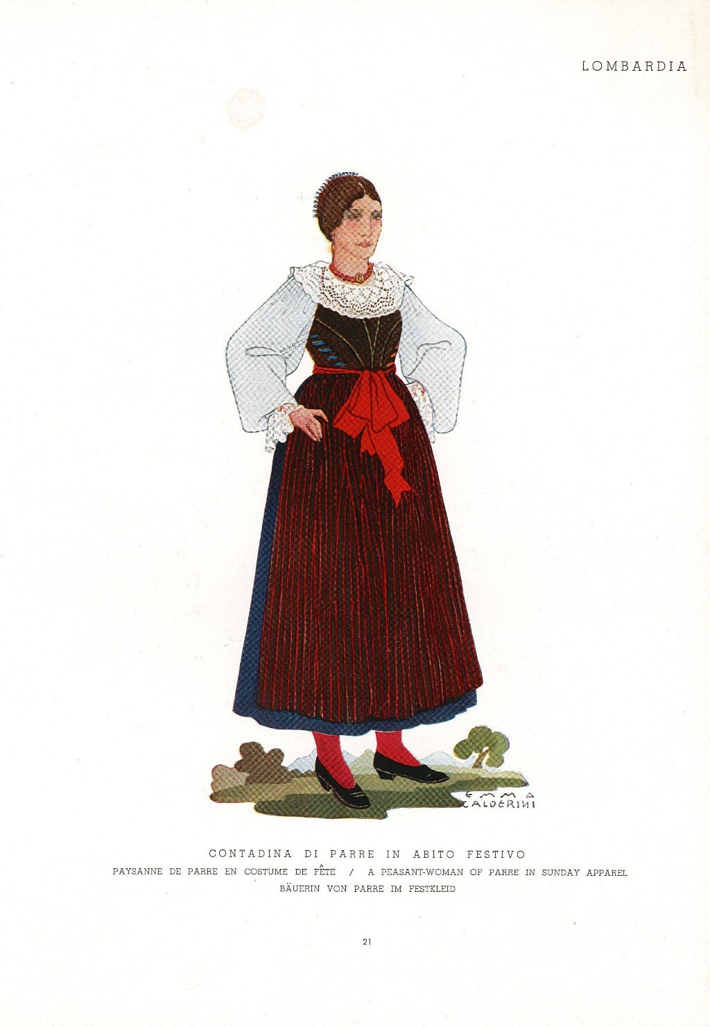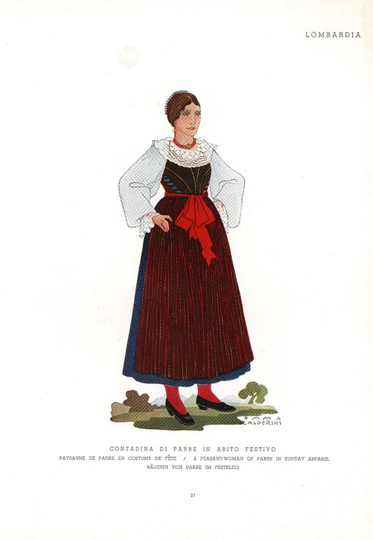 Stampa antica e originale raffigurante il costume caratteristico del luogo. Autore: Calderini Emma. Luogo: Parre - Bergamo. Anno: 1920. Tecnica: tipolitografia. Dimensioni: 185x255.