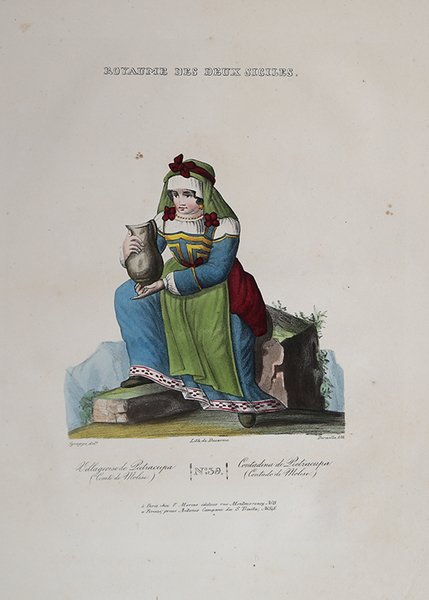 Litografia originale di Levilly su disegno di Sgroppo, tratta dalla rara raccolta Royaume des Deux Siciles. Costumes. Dessines sur lieux, edita a Parigi da P. Marino nel 1826. L'opera presenta il titolo in francese e in italiano perché veniva stampata e venduta anche a Firenze presso l'editore Antonio Campani. Non si hanno altre notizie sul disegnatore Sgroppo. ' Litografia con bellissima coloritura d'epoca, in buone condizioni. ' Non comune. Original lithograph by Levilly from a drawing by Sgroppo, taken from the rare collection Royaume des Deux Siciles. Costumes. Dessines sur lieux, published in Paris by P. Marino in 1826. The title is in French and Italian because it was also printed and sold in Florence by the publisher Antonio Campani. There is no other information on the illustrator Sgroppo. ' Lithograph with beautiful original colouring, in good condition. ' Uncommon. Cfr.