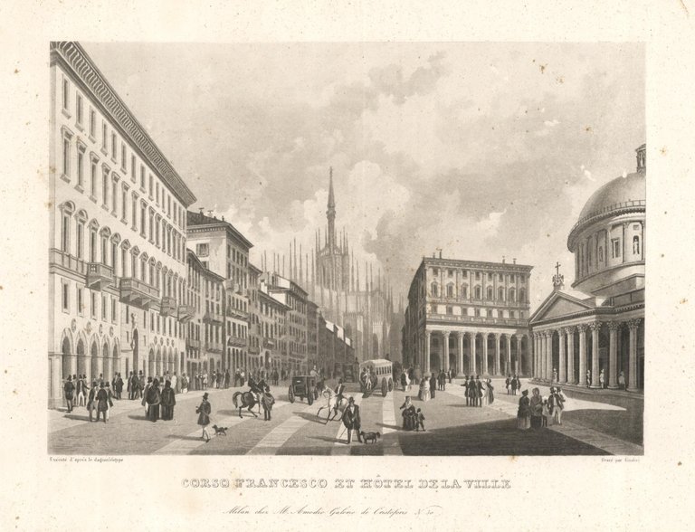 Animata veduta dell'attuale Corso Vittorio Emanuele II, all'epoca Corso Francesco, ripresa dalla piazza di San Carlo al Corso su cui affacciava l'Hotel de la Ville. Autore: Giudici inc. & Amodio M. edit. Luogo: Milano. Anno: 1850 ca. Tecnica: acquatinta. Dimensioni: 166x240 mm. Alcuni segno del tempo che non compromettono l'ottimo stato di conservazione generale. Rif: Arrigoni 1969: I, n° 450