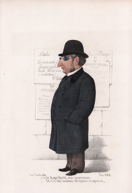 Litografia con coloritura coeva, 1877 circa, firmata in basso ' A. Manganaro. Tavola della celebre serie “Il Palazzo S. Giacomo, Album degli 80 al Municipio di Napoli 1876 e 1877” raccolta di immagini satiriche raffiguranti i rappresentanti dell’amministrazione comunale di Napoli. Vengono effigiate, pertanto, le più importanti figure comunali; giudici, avvocati, architetti, geometri, marittimi etc. sono disegnati con tratti caricaturali e associati con chiari elementi che contraddistinguono la loro professione. Nel 1877 Antonio Manganaro (Manfredonia 1842 – Napoli 1921), uno dei più celebri disegnatori satirici della Napoli della seconda metà del ‘800, dà alle stampe le tavole litografate a colori de ' Il Palazzo S. Giacomo Album degli 80 al Municipio di Napoli 1876 e 1877 ' che ritraggono con tratti caricaturali i rappresentanti dell’amministrazione comunale partenopea di quegli anni. Sul retro di ogni tavola un’ironica biografia racconta le vicende umane e professionali del personaggio raffigurato. Nella copertina dell’Album degli 80 ' ad accogliere il lettore è Ferdinando Ramognini, Delegato Straordinario (oggi si direbbe Commissario) del Municipio di Napoli, nominato dal governo il 1° maggio 1876, a seguito dello scioglimento del consiglio comunale. Di origini liguri, Ramognini (1829 – 1898) era stato uomo di fiducia di Cavour che ne aveva favorito la carriera in ambito governativo. Prima e dopo l’esperienza commissariale napoletana, terminata nel luglio del 1876, fu prefetto in varie città italiane e senatore del Regno d’Italia dal 1892 fino alla morte. L’uomo politico è ritratto da Manganaro in un elegante abito scuro su cui fa bella mostra l’onorificenza di Casa Savoia mentre apre una tenda come un sipario teatrale per mostrare l’entrata in Palazzo San Giacomo del Sindaco Gennaro Sambiase Sanseverino Duca di San Donato con la sua mole poderosa, icona inconfondibile della politica napoletana postunitaria, seguito da consiglieri. ' ' ' ' ' ' ' ' ' ' ' ' Tra le ottanta divertenti caricature dei rappresentanti comunali, tutti argutamente descritti con le proprie particolari caratteristiche fisiognomiche e con sottotitoli che in brevi motti ne sintetizzano l’occupazione o l’indole, va menzionata quella di Camillo Minieri Riccio (Napoli 1813 – ivi 1882), autore di importanti testi sulla storia della dominazione angioina e in generale del regno napoletano. Lo studioso ebbe incarichi di prestigio quali la direzione della Biblioteca di San Giacomo (1863), la nomina di rappresentante della Commissione Municipale per la conservazione dei monumenti (1869) e la direzione dell’Archivio di Stato di Napoli (1874). Nel disegno di Manganaro l’anziano consigliere, a testimonianza dei suoi precipui interessi di studio, è ritratto in una disordinata biblioteca, appollaiato sulla cima di uno scaletto, immerso nella lettura di un grosso volume circondato da altri libri poggiati sui pioli, pronti per essere consultati. ' ' ' ' ' ' ' ' ' ' ' ' Con la sua graffiante matita Manganaro, come altri celebri caricaturisti attivi in quegli anni a Napoli, quali Melchiorre de Filippis Delfico, Enrico Colonna e Mario Buonsollazzi in arte Solatium, prendendo spunto dagli avvenimenti quotidiani, mette alla berlina, ma con garbo ed eleganza, noti personaggi del mondo della politica e della cultura su Album, strenne illustrate e soprattutto giornali satirici come ' L’Arca di Noè, Il bello Gasparre .e basta così, Il Caporal terribile., ' assai diffusi all’indomani dell’Unità d’Italia. In particolare, furono ricercatissime le caricature pubblicate in ' Montecitorio Album dei 500 ' (1872-1874), nel volume ' Consiglio Provinciale di Napoli ' (1880) con gustose caricature di ministri e parlamentari e dei consiglieri provinciali e nell’Album A zonzo ' per le sale dell’Esposizione di Belle Arti di Napoli ' (1877) in cui prende in giro gli artisti del suo tempo. Lithograph with contemporary coloring, circa 1877, signed at bottom ' A. Manganaro. Plate from the famous series ““Il Palazzo S. Giacomo, Album degli 80 al Municipio di Napoli 1876 e 1877” collection of satirical images depicting representatives of the municipal administration of Naples. The most important municipal figures are portrayed; judges, lawyers, architects, surveyors, seafarers etc. are drawn with caricature features and associated with clear elements that distinguish their profession. In 1877 Antonio Manganaro (Manfredonia 1842 - Naples 1921), one of the most famous satirical draughtsmen of Naples in the second half of the 19th century, gave to the presses the color lithographed plates of ' Il Palazzo S. Giacomo Album degli 80 al Municipio di Napoli 1876 e 1877, ' which portray with caricature strokes the representatives of the Neapolitan municipal administration of those years. On the back of each plate, an ironic biography recounts the human and professional events of the person depicted. On the cover of the ' Album degli 80 ' to welcome the reader is Ferdinando Ramognini, Delegato Straordinario (today we would say Commissioner) of the Naples City Hall, appointed by the government on May 1, 1876, following the dissolution of the city council. Of Ligurian descent, Ramognini (1829 - 1898) had been a trusted man of Cavour, who favored his career in government. Before and after his Neapolitan commissarial experience, which ended in July 1876, he was prefect in several Italian cities and senator of the Kingdom of Italy from 1892 until his death. The politician is portrayed by Manganaro in an elegant dark suit on which the honorific of the House of Savoy is beautifully displayed as he opens a curtain like a theatrical curtain to show the entrance into Palazzo San Giacomo of Mayor Gennaro Sambiase Sanseverino Duca di San Donato with his mighty bulk, an unmistakable icon of post-unification Neapolitan politics, followed by councilors. ' ' ' ' ' ' ' ' ' ' ' ' Among the eighty amusing caricatures of 