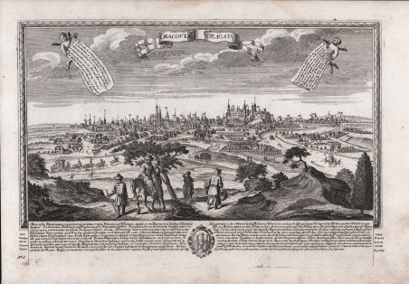Bella e rara veduta panoramica della città delineata sulla scia della più grandi vedute disegnate da Fredrich Bernhard Werner e pubblicata ad Augsburg dagli eredi dell’editore Jeremias Wolff (1663-1724), Georg Balthasar Probst (1673-1750) – suo genero – e il suo successore, il figlio Johann Friedrich (1719-1781). Werner, nato a Reichenau, fu disegnatore, incisore, ingegnere e scenografo; durante la sua intensa vita viaggiò a lungo in vari stati europei prima in qualità di soldato poi come semplice viaggiatore, realizzando numerosi disegni dei luoghi visitati. Dopo aver trascorso un periodo di studio ad Augsburg collaborando con l’incisore K. Remshard, nel 1730 egli intraprese un viaggio in Italia, visitando molte città della penisola, per poi diventare ingegnere e scenografo del re di Prussia. La sua vasta produzione comprende una molteplicità di lavori dedicati a luoghi e città di vari paesi europei – Polonia, Olanda, Francia, Italia – soffermandosi in particolare sulla sua patria, alla quale sono dedicate le immagini della “Scenografia urbium Silesiae”, edita dagli eredi di Johann Baptist Homann a Norimberga. Werner può essere considerato uno dei più prolifici disegnatori della sua generazione, uno degli ultimi grandi personaggi che nel corso del Settecento si dedicano alla realizzazione del ritratto di città rappresentando la struttura urbana nella sua interezza, nel solco di una tradizione ormai secolare; nel corso del secolo le logiche che si affermeranno saranno invece da un lato quelle che frantumeranno la città in più immagini, dall’altro quelle che porteranno alla definitiva affermazione della topografia scientifica. Le immagini del Werner costituiscono un modello per la realizzazione di alcune altre vedute edite in Europa. Tra queste vanno ricordate quella dell’editore viennese Christofer Haffner (1668-1754), attivo probabilmente tra il 1720 e il 1750, e quelle di Johann Christian Leopold (1699-1755). Il Leopold, era un modesto incisore ed editore di Augsburg; la sua serie di vedute di città, da cui questa incisione è tratta, venne pubblicata con pochissima tiratura, rendendo quindi le opere particolarmente rare. Incisione in rame, in ottimo stato di conservazione. Beautiful and rare panoramic view of the city sketched in the wake of the greatest views drawn by Fredrich Bernhard Werner and published in Augsburg by the heirs of publisher Jeremias Wolff (1663-1724), Georg Balthasar Probst (1673-1750) - his son-in-law- and his successor, his son Johann Friedrich (1719-1781). Werner, born in Reichenau, was a draughtsman, engraver, engineer and stage designer; during his busy life he traveled extensively in various European states first as a soldier then as a simple traveler, producing numerous drawings of the places he visited. After spending a period of study in Augsburg working with engraver K. Remshard, he undertook a trip to Italy in 1730, visiting many cities on the peninsula, later becoming engineer and set designer to the King of Prussia. His vast output includes a multiplicity of works devoted to places and cities in various European countries - Poland, Holland, France, Italy - dwelling particularly on his homeland, to which the images of the "Scenografia urbium Silesiae", published by the heirs of Johann Baptist Homann in Nuremberg, are dedicated. Werner can be considered one of the most prolific draughtsmen of his generation, one of the last great figures during the eighteenth century to devote himself to the creation of the city portrait by depicting the urban structure in its entirety, in the wake of a tradition that was now centuries old; in the course of the century, the logics that would assert themselves would instead be, on the one hand, those that would break the city into several images, and on the other, those that would lead to the definitive establishment of scientific topography. Werner's images provide a model for the creation of a number of other views published in Europe. These include those of the Viennese publisher Christofer Haffner (1668-1754), active probably between 1720 and 1750, and those of Johann Christian Leopold (1699-1755). Leopold, was a modest Augsburg engraver and publisher; his series of city views, from which this engraving is taken, was published with very few print runs, thus making the works particularly rare. Copperplate engraving, in very good condition. Cfr.