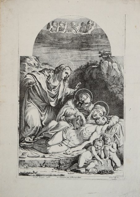 Acquaforte, circa 1670, firmata in lastra in basso a destra. Dal dipinto di Annibale Carracci. Esemplare di secondo stato con l’indirizzo di Remondini. Magnifica prova, impressa su carta vergata coeva con filigrana “tre lune”, con ampi margini, leggere pieghe di stampa, per il resto in perfette condizioni. Rara opera di questo poco conosciuto allievo di Simon Vouet. Fainting Virgin lying with the body of Christ in her arms, and Sts John and Mary Magdalene going to her aid; arched composition after CarracciEtching, circa 1670, signed at lower right. After Annibale Carracci. A fine impression of the second state of two with the Remondini address, on contemporary paper with " three moon" watermark, wide margins, good conditions. Rare. Cfr. Robert-Dumesnil p. 256, 2; IFF 2.