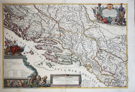 Carta estremamente dettagliata della costa adriatica, dal Montenegro a sud fino alla costa della Croazia centrale (Zara, ecc.), e che copre gran parte della Bosnia-Erzegovina. Mostra le divisioni amministrative, le città, i paesi, i punti di riferimento, le chiese, le foreste, i fiumi e le montagne. Include una nota, un elenco di nomi antichi e moderni e il testo della dedica "All'Illmo. et Raymo. Sigre. Monaigr. Lorenzo Casoni Segretario della Cifra di N.S. Papa Innocenzo XI . Gio. Iacomo de Rossi". Markovi? (Descriptio Croatiae) sostine che Cantelli è il più importante cartografo della regione croata. Grande carta geografica composta da due fogli di atlante uniti, raffiguranti le coste dalmate. Il titolo, la legenda esplicativa con la tavola delle corrispondenze toponomastiche e le dediche sono iscritti entro cartigli riccamente ornati. La carta è graduata su tutto il perimetro, sia nel senso della latitudine, che nel senso della longitudine. ' Carta geografica tratta dal ' Mercurio geografico overo Guida Geografica in tutte le parti del Mondo conforme le Tavole Geografiche del Sansone Baudran de Cantelli Data in luce con direttione, e cura di Gio. Giacomo de Rossi nella sua stamperia ' raccolta di carte edita a Roma tra il 1660 ed il 1730 dalla tipografia De Rossi - la datazione delle carte va dal 1669 al 1715 - la cui prima stesura si deve a Giovanni Giacomo de Rossi. Nel corso degli anni l’atlante fu arricchito da un numero sempre maggiore di carte nelle successive edizioni curate prima da Domenico de Rossi e poi dal figlio Filippo. Il ' Mercurio Geografico ' è una raccolta che raccoglie lavori di cartografi quali Michele Antonio Baudrand, Nicolas Sanson, Augustin Lubin, Filippo Titi, Giacomo Ameti, Giovanni Antonio Magini e Innocenzo Mattei e che ' contempla come "corpus" principale ' la grande produzione del geografo Giacomo Cantelli da Vignola. Le carte sono finemente copiate ed intagliate dai maggiori incisori dell'epoca tra i quali Falda, Widman, Barbey, Widman, Lhuillier, Donia, Mariotti. ' Cantelli era un geografo e cartografo, originario di Montorsello presso Vignola; compiti gli studi umanistici a Bologna, nel 1669, entrò ivi a servizio del marchese Obizzo da Ferrara come segretario, poi passò a Venezia e di là a Parigi, dove strinse rapporti coi maggiori geografi francesi del tempo, il Du Val, Nicola Sanson e specialmente Michel Antoine Baudrand, col quale rimase poi sempre in corrispondenza. Tornato a Bologna, fu per lunghi anni segretario di Rinieri Marescotti; ma, intorno al 1675 o poco dopo, si recò, forse più volte, a Roma, ed entrò in relazione con la celebre officina cartografica dei De Rossi, la quale pubblicò poi la massima parte delle sue carte geografiche. La sua fama di cartografo si era ormai consolidata, tanto che venne chiamato sia dal papa Innocenzo XI che dal duca di Modena e Reggio Francesco II d'Este, che lo desideravano entrambi come cartografo ufficiale. Scelse la corte di Francesco II, e in novembre 1685 fu nominato geografo di corte. Dal 1686 al 1689 eseguì numerose carte di paesi e territori europei. Costruì di sua mano un mappamondo e un globo celeste, che rimasero esposti per qualche tempo nell'atrio della Biblioteca Estense a Modena. Morì in Modena il 30 novembre 1695. Quasi tutte le carte furono inserite nel ' Mercurio Geografico, ' il notissimo atlante pubblicato a Roma dai De Rossi. Nella prima edizione del ' Mercurio Geografico ' furono pubblicate 19 sue carte, assieme ad altre del Sanson e del Baudrand. Nel 1692 uscì una seconda edizione in due volumi, che conteneva lavori da lui eseguiti (88 carte, intagliate al bulino dall'incisore Antonio Barbey). Incisione in rame, ' finemente colorata a mano, ' in ottimo stato di conservazione. Bibliografia cfr. R. Almagià, ' Studi storici di cartografia napoletana, in “Archivio storico per le province napoletane”, 38 (1913), p. 645; A. Bonazzi, ' Il Mercurio geografico: il gioco e la differenza, in “Giacomo Cantelli: . The Cantelli - De Rossi map of Croatia, Bosnia-Herzegovina and Montenegro Highly detailed map of the Adriatic Coastline, from Montenegro in the south to the coast of central Croatia (Zadar, etc.), and covering a large part of Bosnia-Herzegovina. Shows administrative divisions, cities, towns, landmarks, churches, forests, rivers and mountains. Includes note, list of ancient and modern names and dedication text "All'Illmo. et Raymo. Sigre. Monaigr. Lorenzo Casoni Secretario della Cifra di N.S. Papa Innocenzo XI . Gio. Iacomo de Rossi." Markovi? (Descriptio Croatiae) notes that Cantelli is the most important mapmaker of the Croatian region. The title, the legend with the toponimics and the dedications have all been inscribed into finely embellished cartouches. ' The map bears degrees along its longitudinal perimeter. ' Copper engraving, contemporary outline colour, in excellent condition. Map taken from ' Mercurio geografico overo Guida Geografica in tutte le parti del Mondo conforme le Tavole Geografiche del Sansone Baudran de Cantelli Data in luce con direttione, e cura di Gio. ' Giacomo de Rossi nella sua stamperia ' collection of maps published in Rome between 1660 and 1730 by the typography De Rossi - the date of the maps goes from 1669 to 1715 - whose first edition is due to Giovanni Giacomo de Rossi. Over the years the atlas was enriched by an increasing number of maps in subsequent editions edited first by Domenico de Rossi and then by his son Filippo. The ' Mercurio Geografico ' is a collection that brings together works by cartographers such as Michele Antonio Baudrand, Nicolas Sanson, Augustin Lubin, Filippo Titi, Giacomo Ameti, Giovanni Antonio Magini and Innocenzo Mattei, and which includes as its main "corpus" the great production of the geographer Giacomo Cantelli da Vignola. The maps are finely copied and engraved by the major engravers of the time including Falda, Widman, Barbey, Widman, Lhuillier, Donia, Mariotti. ' Cantelli was a geographer and ca