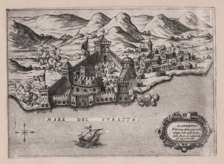 Rara veduta dello stretto, parte del celebre "Isole Famose" di Camocio.Tra il 1560 ed 1575 Camocio pubblicò circa quaranta carte di grande formato e molte furono le carte di piccolo formato pubblicate sciolte tra il 1566 e il 1574, che andarono successivamente a formare il volume noto col nome "Isole famose, porti, fortezze e terre marittime sottoposte alla Serenissima Signoria di Venetia, ed altri Principi Christiani, et al Signor Turco, nouamente poste in luce. In Venetia alla libreria del segno di San Marco". Le carte inserite nell’isolario di Camocio hanno la lastra ritoccata e un numero sequenziale aggiunto, mentre le prime prove sono caratterizzate dalla grande qualità di stampa e dall’assenza del numero. Gli esemplari con la numerazione sono, invece, quelli inseriti nelle edizioni dell'isolario edite da Donato Bertelli - imprint In Venetia alla libreria del segno di San Marco. Tale edizione, sebbene priva di data, risale a dopo il 1575, anno in cui il Camocio scomparve durante l'epidemia di pestilenza a Venezia e gran parte della sua tipogrfaia fu acquisita dal Bertelli.Raro primo stato, avanti la numerazione. Acquaforte e bulino, in buono stato di conservazione.Bibliografia: S. Bifolco, Città e Fortezze Principali del Mondo, in Bifolco-Ronca "Cartografia e Topografia Italiana del XVI secolo. Catalogo ragionato delle opere a stampa" (2018), pp. 126, 140-141. A rare view of the strait of Dardanelli, form Camocio's "Isole Famose".This work, as was usual for Camocio and his other contemporary publishers, was on the market as loose map and later included in the "Isole famose, porti, fortezze e terre marittime sottoposte alla Serenissima Signoria di Venetia, ed altri Principi Christiani, et al Signor Turco, nouamente poste in luce. In Venetia alla libreria del segno di San Marco". The issue with the numbers are, instead, those inserted in the editions of the book published by Donato Bertelli - showing the imprint In Venetia alla libreria del segno di San Marco. This edition, although without date, dates back to after 1575, the year in which the Camocio disappeared during the pestilence epidemic in Venice and much of its typography was acquired by Bertelli.Rare second state of three, before the number. Etching with engraving, in good condition.Bibliografia: S. Bifolco, Città e Fortezze Principali del Mondo, in Bifolco-Ronca "Cartografia e Topografia Italiana del XVI secolo. Catalogo ragionato delle opere a stampa" (2018), pp. 126, 140-141. Cfr. S. Bifolco, Città e Fortezze Principali del Mondo, in Bifolco-Ronca "Cartografia e Topografia Italiana del XVI secolo. Catalogo ragionato delle opere a stampa" pp. 126, 140-141, n. 67.