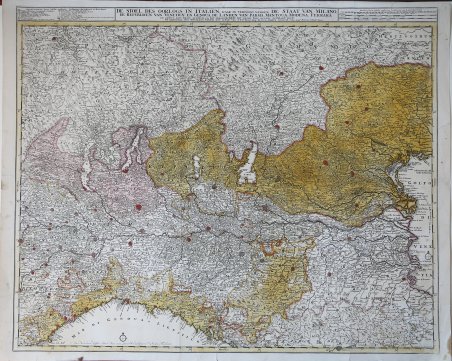 La carta geografica rappresenta una parte dell'Italia settentrionale: precisamente, i territori degli stati di Milano, Venezia, Genova, Parma, Mantova, Modena e Ferrara. Le catene montuose sono rese pittoricamente e i confini tra gli stati sono sottolineati dall'uso di differenti colori. Nell'elenco dei segni convenzionali si trovano anche le vie percorse dall'esercito imperiale e i luoghi degli accampamenti e del battaglie.La carta fu probabilmente incisa attorno al 1701. Dalle numerose iscrizioni presenti sulla carta è possibile supporre che essa costituisse parte dell'opera "Atlas minor sive geographia compendiosa qua orbis terrarum per paucas attamen novissimas tabulas ostenditur" di Nicolaes Visscher (qui latinizzato in "Nicolaus Visser"), un grande atlante in folio edito ad Amsterdam a partire dal 1682/1683 e più volte riedito dopo la morte di Visscher (sei edizioni tra 1702 e 1716). Non è possibile stabilire con certezza, tuttavia, a partire da quale edizione dell'atlante la carta in esame risulta compresa.Incisa da Autore Van Anze Luggert. The map represents a part of northern Italy: precisely, the territories of the states of Milan, Venice, Genoa, Parma, Mantua, Modena and Ferrara.The mountains are rendered pictorially and the borders between the states are underlined by the use of different colors.This map was probably engraved around 1701. From the numerous inscriptions on paper it is possible to suppose that it constituted part of the work "Atlas minor sive geographia compendia qua orbis terrarum for paucas attamen novissimas tabulas ostenditur" by Nicolaes Visscher (here Latinized in "Nicolaus Visser"), a large atlas in folio published in Amsterdam from 1682/1683 and several times re-edited after Visscher's death (six editions between 1702 and 1716). It is not possible to establish with certainty, however, from which edition of the atlas the paper in question is included. Cfr.