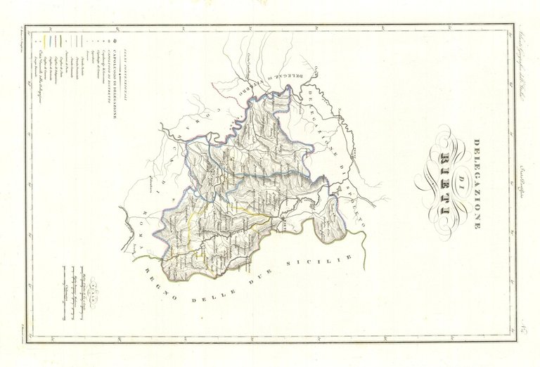 Carta geografica, antica ed originale, con rappresentazione della divisione territoriale del territorio di Rieti con evidenziati i territori nei dintorni di Poggio Mirteto, Rocca Sinibalda, Canemorto (Orvinio). Inserita nel I volume dell'opera "Atlante Geografico degli Stati Italiani delineato sopra le migliori e più moderne mappe per servire di corredo alla Corografia Fisica Storica e Statistica dell'Italia" contenente le carte dell'Italia Superiore. Descritta da Attilio Zuccagni-Orlandini, edita e stampata a Firenze nel 1844-45. Autore: Zuccagni - Orlandini edit. & G.Maina e V.Stanghi inc. Luogo: Rieti. Anno: 1844. Tecnica: incisione in rame. Dimensioni: 518x337 mm. L'incisione è caratterizzata da una coloritura coeva ai confini