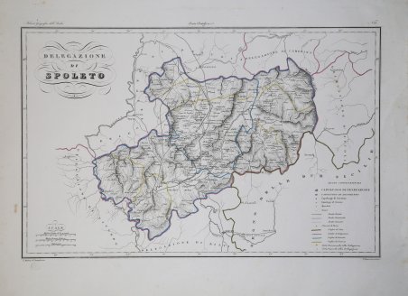 Carta geografica tratta dall’Atlante geografico degli Stati italiani delineato sopra le migliori e più moderne mappe per servire di corredo alla corografia fisica storica e statistica dell'Italia, di Attilio Zuccagni Orlandini stampato a Firenze, presso gli editori, 1844. In 2° massimo, 2 voll. Il primo volume contenente le carte dell’Italia Superiore in 52 fogli, il secondo volume quelle dell’Italia Inferiore in 77 fogli. Attilio Zuccagni Orlandini (1784-1872) nacque a Fiesole con il nome di Giuseppe Orlandini. In seguito all’adozione da parte del facoltoso zio materno Attilio Zuccagni (1754-1807), botanico e georgofilo, assunse il nome di Attilio Zuccagni Orlandini. La sua più importante opera è la relazione geografico-cartografica di tutti gli Stati preunitari italiani, la grandiosa Corografia fisica, storica e statistica dell’Italia e delle sue Isole (Firenze 1835-1845), in dodici volumi per diciannove tomi, con un volume introduttivo sull’intera penisola italiana. L’opera costituì la summa delle centinaia di opere geografiche generali, regionali e locali allora disponibili e presentava, per ogni Stato preunitario, la trattazione fisica, storica, topografica e un inquadramento statistico. Nel 1844-45, la Corografia fu arricchita con cinque volumi di cartografie, vedute e altre illustrazioni di luoghi e monumenti: Atlante geografico degli Stati italiani delineato sopra le migliori e più moderne mappe (due volumi con 144 tavole inclusa la grande carta della penisola in 15 fogli) e Atlante illustrativo ossia raccolta dei principali monumenti italiani antichi, del medio evo e moderni e di alcune vedute pittoriche (tre volumi con 413 illustrazioni, stampate su 269 fogli). Le tavole furono incise, sempre a Firenze, in due apposite officine, da quattro valenti artisti lombardi (Vittorio Angeli, Giacinto Maina, Pietro Manzoni e Giuseppe Pozzi). ' Soprattutto il primo dei due atlanti rappresenta, ancora oggi, una pietra miliare nella storia della cartografia e dell’iconografia geografica italiana. Fu veramente ‘un’ardua impresa’, dal momento che spesso mancavano ancora (come, ad esempio, per il Ducato di Lucca e lo Stato Pontificio) prodotti cartografici compiutamente geometrici. I due prodotti furono presentati ai Georgofili nel 1843 e nel 1844, insieme alla mappa della Repubblica di San Marino. L’opera si rivelò oltremodo costosa e non ottenne il successo commerciale sperato, ma servì da base per tante altre iniziative editoriali successive che vi attinsero, talora senza neppure rispettarne i diritti d’autore. Incisione in rame, coloritura coeva dei contorni, lievi ossidazioni, per il resto in ottimo stato di conservazione. ' Bibliografia Cfr. Anna Guarducci - Dizionario Biografico degli Italiani - Volume 100 (2020). Map taken from the Atlante geografico degli Stati italiani delineato sopra le migliori e più moderne mappe per servire di corredo alla corografia fisica storica e statistica dell'Italia, di Attilio Zuccagni Orlandini printed in Florence, 1844. The first volume contains the maps of Northern Italy in 52 sheets, the second volume those of Southern Italy in 77 sheets. Attilio Zuccagni Orlandini (1784-1872) was born in Fiesole under the name of Giuseppe Orlandini. Following adoption by his wealthy maternal uncle Attilio Zuccagni (1754-1807), a botanist and georgofile, he took the name Attilio Zuccagni Orlandini. His most important work is the geographic-cartographic report of all the pre-unification Italian states, the great Corografia fisica, storica e statistica dell'Italia e delle sue Isole (Florence 1835-1845), in twelve volumes for nineteen tomes, with an introductory volume on the entire Italian peninsula. The work constituted the sum of hundreds of general, regional and local geographic works then available and presented, for each pre-unification state, the physical, historical, topographical and statistical framework. In 1844-45, the Corografia was enriched with five volumes of maps, views and other illustrations of places and monuments: Atlante geografico degli Stati italiani delineato sopra le migliori e più moderne mappe (two volumes with 144 plates including the large map of the peninsula in 15 sheets) and Atlante illustrativo ossia raccolta dei principali monumenti italiani antichi, del medio evo e moderni e di alcune vedute pittoriche (three volumes with 413 illustrations, printed on 269 sheets). The plates were engraved, again in Florence, in two special workshops, by four talented Lombard artists (Vittorio Angeli, Giacinto Maina, Pietro Manzoni and Giuseppe Pozzi). ' Especially the first of the two atlases represents, even today, a milestone in the history of cartography and Italian geographic iconography. It was truly 'an arduous undertaking', since cartographic products were often still lacking (as, for example, for the Duchy of Lucca and the Papal States) fully geometric. The two products were presented to the Georgofili in 1843 and 1844, along with the map of the Republic of San Marino. The work proved to be very expensive and did not achieve the commercial success hoped for, but served as a basis for many other subsequent publishing initiatives that drew on it, sometimes without even respecting the copyright. ' Copperplate with fine outline colour, good condition. ' Literature Anna Guarducci - Dizionario Biografico degli Italiani - Volume 100 (2020). Cfr.