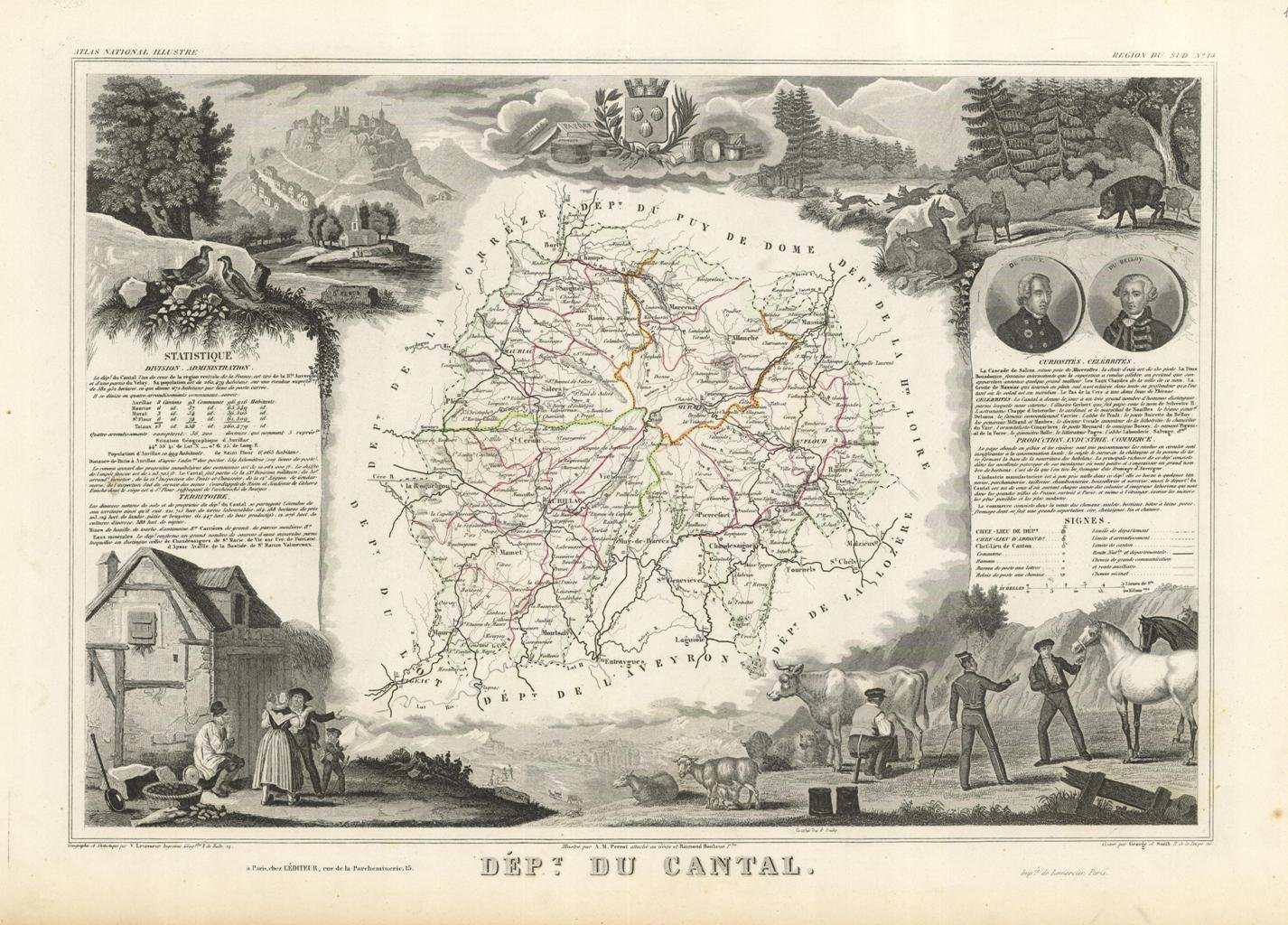 Carta geografica particolareggiata del dipartimento entro ricca e decorativa cornice, confini colorati all'epoca