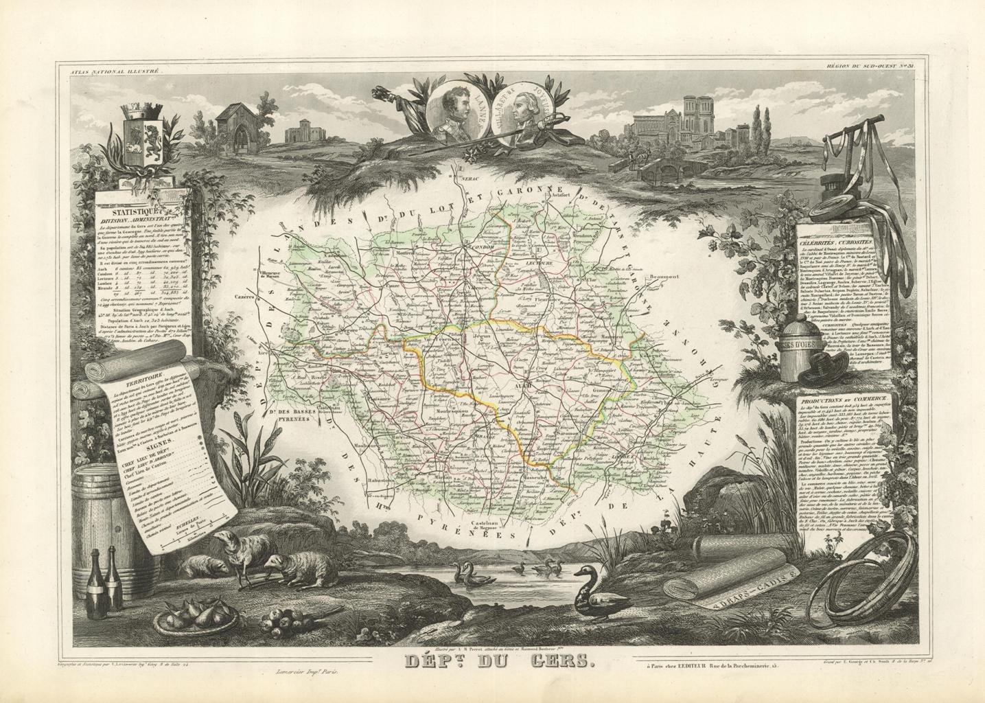 Carta geografica particolareggiata del dipartimento entro ricca e decorativa cornice, confini colorati all'epoca