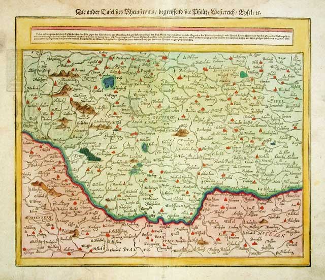 Carta geografica raffigurante parte della Germania occidentale e del corso del fiume Reno. Colorata