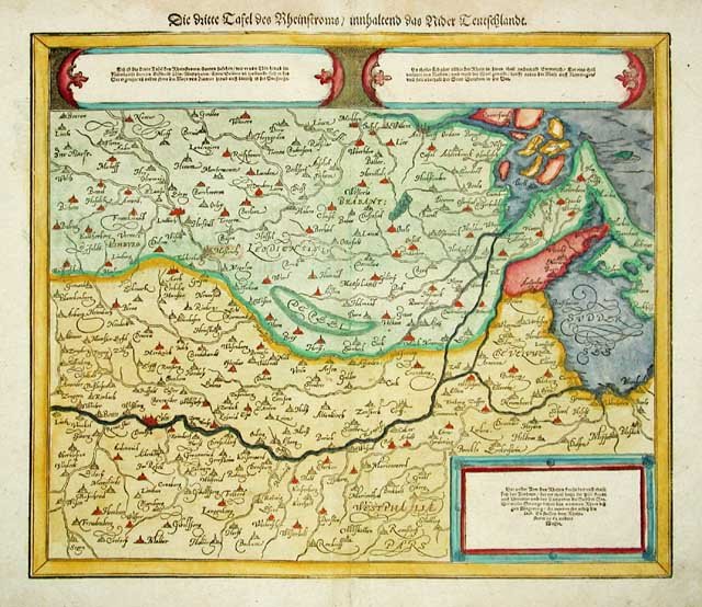 Carta geografica raffigurante parte della Germania occidentale e del corso del fiume Reno. Colorata