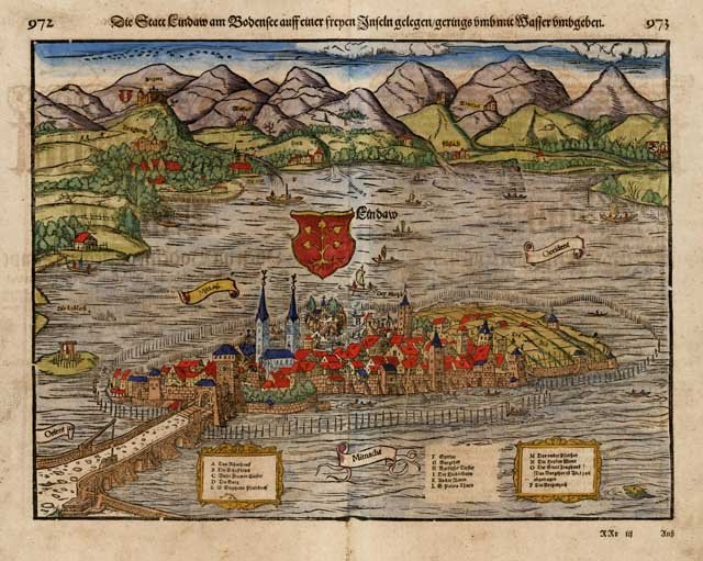 Die Statt Lindaw am Bodensee auff einer freyen Inseln gelegen / gerings umb mit Wasser umbgeben | Stampe | Munster Sebastian (Ingelheim1488 - Basilea1552), Munster Sebastian