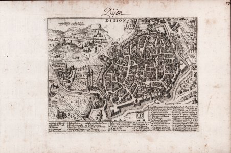 Pianta della città tratta da Heroico Splendore delle Città del Mondo, rarissima pubblicazione stampata per la prima volta a Roma nel 1639, e successivamente, ampliata con l’aggiunta di dieci nuove opere, nel 1642. In alto al centro il titolo DIGION. In basso a destra la firma I. Laurus f. 1628. L’orientazione è fornita da una schematica rosa dei venti, il nord in basso. Lungo il bordo inferiore disposta su sette colonne una legenda numerica di 59 rimandi a luoghi cose e monumenti notabili. ' Giacomo Lauro, fu incisore, stampatore e conoscitore di antichità attivo prevalentemente in ambito romano tra il 1583 e il 1645. Non si conosce la data e il luogo di nascita, ma il fatto che egli firmasse le sue opere come "Jacobus Laurus Romanus" lascia presumere che fosse originario di Roma. Nulla si conosce della sua formazione. La prima testimonianza documentaria che attesta la sua presenza a Roma, in cui è definito "intagliatore di rame romano", risale al 1583; mentre la sua prima stampa conosciuta è un Tiberio con la daga (o Il gladiatore), pubblicata da Claudio Duchetti nel 1585. Nonostante abbia affrontato tematiche storiche, mitologiche, devozionali, il Lauro è noto soprattutto per la produzione di piante e vedute di città, a cominciare dalla veduta a volo d'uccello di Rocca Contrada (Arcevia), realizzata nel 1594 per Angelo Rocca su disegno di Ercole Ramazzani. Negli anni 1630-45, Lauro si dedicò alla pubblicazione di una serie di piante e descrizioni di città italiane e straniere in forma di piccoli opuscoli, alcuni dei quali furono raccolti nel 1639 sotto il titolo di Heroico splendore delle città del mondo. Le piante di Lauro, dunque, furono il frutto di un lungo lavoro di ricerca, basato su fonti primarie, e pubblicato per la prima volta in libri o opuscoli con testo relativo alla storia della città. Scrive Thomas Ashby: “Negli anni 1630-1645 il Lauro pubblicò un numero rilevante di descrizioni di città in tanti opuscoli col testo, tutti in folio piccolo oblungo. Le piante non sono tutte originali […] Molte volte sono state adoperate come fonti, s’intende, le belle tavole dell’atlante del Lafrèry. Ma anche altre piante sono state messe sotto contributo - molto è stato preso o dall’opera di Braun e Hogenberg, Civitales Orbis Terrarum, oppure anche in questo caso da fonti comuni. Non mancano i contatti con Matteo Florimi di Siena, il quale in nessun caso compì di opera propria, ma copiò sempre i lavori degli altri. La pianta di Viterbo, finalmente, è derivata dalla pianta di Tarquinio Ligustri di Viterbo, fatta nel 1596 e dedicata al Cardinale Odoardo Farnese, Alcune di queste piante furono raccolte sotto il titolo seguente, inciso nel 1639; HEROICO SPLENDORE DELLE CITTA DEL MONDO LIBRO PRIMO DI IACOMO LAURO ROMANO Dove si uedono le piante di molte Citta Ill.ri e di molte non più state alla stampa con le loro origini et atti segnalati, et quanto si estende il dominio di esse sino alli presenti tempi in Roma l’Anno di nostra salute 1639” (cfr. Thomas Ashby, L'Heroico splendore delle città del mondo, in “La Bibliofilia”, XXXI (1929), pp. 105-122). L’opera venne ristampata nel 1642 con imprint in Roma l’Anno di nostra salute 1642 /Con priuilegio del somo Pontefice, et d'altri Potent.ti Con licenza de Superiori. Sebbene nel frontespizio si parli di “Libro primo” un secondo volume della raccolta non venne mia pubblicato. Incisione in rame, stampata su carta vergata coeva, con margini, leggerissime ossidazioni, per il resto in ottimo stato di conservazione. Rarissima. Bibliografia Ashby (1929): p. 120, n. 31; Cremonini (1991): pp. 37-38, n. 40; Ganado (1994): p. 167, n. 9; ' Thomas Ashby, Un incisore antiquario del Seicento, I, Note intorno alla vita ed opere di Giacomo Lauro, in “La Bibliofilia”, XXVIII (1926-27), pp. 361-373; II, L'opera "Antiquae Urbis splendor", ibid., pp. 453-460; III, ibid., XXIX (1927), pp. 356-369; IV, L'Heroico splendore delle città del . Map of the city taken from ' Heroico Splendore delle Città del Mondo, ' a very rare publication printed for the first time in Rome in 1639, and later, expanded with the addition of ten new works, in 1642. Giacomo Lauro, was an engraver, printer and connoisseur of antiquities active mainly in Rome between 1583 and 1645. We do not know the date and place of birth, but the fact that he signed his works as "Jacobus Laurus Romanus" suggests that he was a native of Rome. Nothing is known about his education. The first documentary evidence of his presence in Rome, in which he is defined as a "Roman copper engraver", dates back to 1583; while his first known print is a ' Tiberius with a dagger ' (or ' The Gladiator), published by Claudio Duchetti in 1585. Although he dealt with historical, mythological, devotional themes, Lauro is mainly known for the production of plans and views of cities, starting with the bird's eye view of Rocca Contrada (Arcevia), made in 1594 for Angelo Rocca on a drawing by Ercole Ramazzani. In the years 1630-45, Lauro dedicated himself to the publication of a series of maps and descriptions of Italian and foreign cities in the form of small pamphlets, some of which were collected in 1639 under the title of ' Heroico Splendore delle Città del Mondo. Lauro's plans, therefore, were the result of a long research work, based on primary sources, and published for the first time in books or pamphlets with text related to the history of the city. Thomas Ashby writes: "In the years 1630-1645 the Lauro published a considerable number of descriptions of cities in many pamphlets with text, all in small oblong folio. The plants are not all original [.] Many times have been used as sources, of course, the beautiful plates of the Atlas of Lafrèry. But other maps were also contributed - much was taken either from the work of Braun and Hogenberg, ' Civitales Orbis Terrarum, or even in this case from common sources. There is no lack of contact with Matteo Florimi of Siena, who