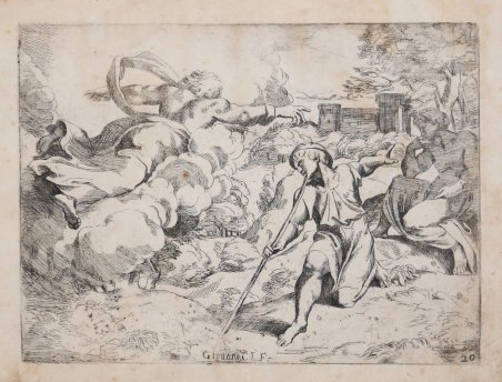 Acquaforte, circa 1607, firmata in lastra. Bellissima prova, con pieni margini, alcuni strappi nei margini bianchi dove sono presenti delle leggere gore d’acqua che non intaccano la parte incisa, per il resto in buono stato di conservazione. La tavola appartiene alla famosa Bibbia di Raffaello, incisa da Sisto Badalocchio e Giovanni Lanfranco, dal titolo Historia del Testamento Vecchio dipinta in Roma nel Vaticano da Raffaello da Urbino et intagliata in rame da Sisto Badalocchi et Giovanni Lanfranchi Parmigian. Al Sig. Annibale Carracci. In Roma appresso a Giovanni Orlandi. Con licenza de' Superiori. 1607. La serie fu realizzata intorno al 1607 a Roma, dove i due artisti erano allievi di Annibale Carracci; 28 delle tavole sono incise da Lanfranco, 23 da Badalocchio. Le opere derivano dagli affreschi di Raffaello nella loggia del Vaticano. Scrive Michael Bury in The Print in Italy, BM 2001, cat.90: “The etchings reverse Raphael's compositions. Mussini noted a tendency to simplification and alteration, especially in Badalocchio (Mussini, 1979, p.61); Borea suggested that the prints are the result of some critical reflection (1986, p.xvi). In the plate shown here, the spatial structure is substantially altered by cutting the height of the scene, making Isaac's head almost touch the top edge. This is in line with what is done in many others, by Sisto Badalocchio as well as Lanfranco. The effect is to increase the size and impact of the figures, for it is their movements and their relationships with one another that are at the centre of attention. The long dedication to Annibale Carracci reveals that the drawings had been made during the previous summer, while the Pope was away from the Vatican. Annibale's illness had prevented Badalocchio and Lanfranco from studying with him, and, keen to pursue their studies during this period, they had turned to the work of Raphael, whom Annibale always praised so much. They had now decided to publish their drawings for the benefit of young students of painting who live far away, executing them in etching 'for greater speed' ("per maggiore prestezza"). It is pointed out that not everyone has appreciated the Loggie frescoes as much as they deserve, believing them to have only been designed by Raphael; however for the variety of the inventions and for their sublime subjects they are worthy of the highest regard. Ginzburg Carignani (1996, p.130 and n.112) has shown that the preface was not in fact written by the two pupils, but by G.B.Agucchi (1570-1632) the patron and writer on art. Agucchi was a great champion of the Carracci and of Annibale in particular, seeing them as the reformers who had restored painting to the true path marked out first by the ancients and then, in modern times, by Raphael”. Plate of the Raphael Bible etched by Badalocchio and Lanfranco, titled Historia del Testamento Vecchio dipinta in Roma nel Vaticano da Raffaello da Urbino et intagliata in rame da Sisto Badalocchi et Giovanni Lanfranchi Parmigian. Al Sig. Annibale Carracci. In Roma appresso a Giovanni Orlandi. Con licenza de' Superiori. 1607. The series consists of 54 plates, a frontispiece and three etched plates with dedicatory text to Annibale Carracci and 50 plates after Raphael that are numbered from 5 to 54. The set was made when the two etchers were both young pupils of Carracci in Rome in 1607 and were said to have been made to try to lift him out of depression; 28 plates are by Lanfranco (Bartsch XVIII.345.1 to 28) and 23 (including the frontispiece) by Badalocchio (Bartsch XVIII.354.1 to 23). From Michael Bury, The Print in Italy, BM 2001, cat.90: “The etchings reverse Raphael's compositions. Mussini noted a tendency to simplification and alteration, especially in Badalocchio (Mussini, 1979, p.61); Borea suggested that the prints are the result of some critical reflection (1986, p.xvi). In the plate shown here, the spatial structure is substantially altered by cutting the height of the scene, making Isaac's head almost touch the top edge. This is in line with what is done in many others, by Sisto Badalocchio as well as Lanfranco. The effect is to increase the size and impact of the figures, for it is their movements and their relationships with one another that are at the centre of attention. The long dedication to Annibale Carracci reveals that the drawings had been made during the previous summer, while the Pope was away from the Vatican. Annibale's illness had prevented Badalocchio and Lanfranco from studying with him, and, keen to pursue their studies during this period, they had turned to the work of Raphael, whom Annibale always praised so much. They had now decided to publish their drawings for the benefit of young students of painting who live far away, executing them in etching 'for greater speed' ("per maggiore prestezza"). It is pointed out that not everyone has appreciated the Loggie frescoes as much as they deserve, believing them to have only been designed by Raphael; however for the variety of the inventions and for their sublime subjects they are worthy of the highest regard. Ginzburg Carignani (1996, p.130 and n.112) has shown that the preface was not in fact written by the two pupils, but by G.B.Agucchi (1570-1632) the patron and writer on art. Agucchi was a great champion of the Carracci and of Annibale in particular, seeing them as the reformers who had restored painting to the true path marked out first by the ancients and then, in modern times, by Raphael. Etching, printed on contemporary laid paper, with full margins showing tears at waterstains, otherwise good condition. Cfr. TIB.40.11