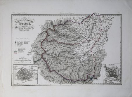 Carta geografica tratta dall’Atlante geografico degli Stati italiani delineato sopra le migliori e più moderne mappe per servire di corredo alla corografia fisica storica e statistica dell'Italia, di Attilio Zuccagni Orlandini stampato a Firenze, presso gli editori, 1844. In 2° massimo, 2 voll. Il primo volume contenente le carte dell’Italia Superiore in 52 fogli, il secondo volume quelle dell’Italia Inferiore in 77 fogli. Attilio Zuccagni Orlandini (1784-1872) nacque a Fiesole con il nome di Giuseppe Orlandini. In seguito all’adozione da parte del facoltoso zio materno Attilio Zuccagni (1754-1807), botanico e georgofilo, assunse il nome di Attilio Zuccagni Orlandini. La sua più importante opera è la relazione geografico-cartografica di tutti gli Stati preunitari italiani, la grandiosa Corografia fisica, storica e statistica dell’Italia e delle sue Isole (Firenze 1835-1845), in dodici volumi per diciannove tomi, con un volume introduttivo sull’intera penisola italiana. L’opera costituì la summa delle centinaia di opere geografiche generali, regionali e locali allora disponibili e presentava, per ogni Stato preunitario, la trattazione fisica, storica, topografica e un inquadramento statistico. Nel 1844-45, la Corografia fu arricchita con cinque volumi di cartografie, vedute e altre illustrazioni di luoghi e monumenti: Atlante geografico degli Stati italiani delineato sopra le migliori e più moderne mappe (due volumi con 144 tavole inclusa la grande carta della penisola in 15 fogli) e Atlante illustrativo ossia raccolta dei principali monumenti italiani antichi, del medio evo e moderni e di alcune vedute pittoriche (tre volumi con 413 illustrazioni, stampate su 269 fogli). Le tavole furono incise, sempre a Firenze, in due apposite officine, da quattro valenti artisti lombardi (Vittorio Angeli, Giacinto Maina, Pietro Manzoni e Giuseppe Pozzi). ' Soprattutto il primo dei due atlanti rappresenta, ancora oggi, una pietra miliare nella storia della cartografia e dell’iconografia geografica italiana. Fu veramente ‘un’ardua impresa’, dal momento che spesso mancavano ancora (come, ad esempio, per il Ducato di Lucca e lo Stato Pontificio) prodotti cartografici compiutamente geometrici. I due prodotti furono presentati ai Georgofili nel 1843 e nel 1844, insieme alla mappa della Repubblica di San Marino. L’opera si rivelò oltremodo costosa e non ottenne il successo commerciale sperato, ma servì da base per tante altre iniziative editoriali successive che vi attinsero, talora senza neppure rispettarne i diritti d’autore. Incisione in rame, coloritura coeva dei contorni, lievi ossidazioni, per il resto in ottimo stato di conservazione. ' Bibliografia Cfr. Anna Guarducci - Dizionario Biografico degli Italiani - Volume 100 (2020). Map taken from the Atlante geografico degli Stati italiani delineato sopra le migliori e più moderne mappe per servire di corredo alla corografia fisica storica e statistica dell'Italia, di Attilio Zuccagni Orlandini printed in Florence, 1844. The first volume contains the maps of Northern Italy in 52 sheets, the second volume those of Southern Italy in 77 sheets. Attilio Zuccagni Orlandini (1784-1872) was born in Fiesole under the name of Giuseppe Orlandini. Following adoption by his wealthy maternal uncle Attilio Zuccagni (1754-1807), a botanist and georgofile, he took the name Attilio Zuccagni Orlandini. His most important work is the geographic-cartographic report of all the pre-unification Italian states, the great Corografia fisica, storica e statistica dell'Italia e delle sue Isole (Florence 1835-1845), in twelve volumes for nineteen tomes, with an introductory volume on the entire Italian peninsula. The work constituted the sum of hundreds of general, regional and local geographic works then available and presented, for each pre-unification state, the physical, historical, topographical and statistical framework. In 1844-45, the Corografia was enriched with five volumes of maps, views and other illustrations of places and monuments: Atlante geografico degli Stati italiani delineato sopra le migliori e più moderne mappe (two volumes with 144 plates including the large map of the peninsula in 15 sheets) and Atlante illustrativo ossia raccolta dei principali monumenti italiani antichi, del medio evo e moderni e di alcune vedute pittoriche (three volumes with 413 illustrations, printed on 269 sheets). The plates were engraved, again in Florence, in two special workshops, by four talented Lombard artists (Vittorio Angeli, Giacinto Maina, Pietro Manzoni and Giuseppe Pozzi). ' Especially the first of the two atlases represents, even today, a milestone in the history of cartography and Italian geographic iconography. It was truly 'an arduous undertaking', since cartographic products were often still lacking (as, for example, for the Duchy of Lucca and the Papal States) fully geometric. The two products were presented to the Georgofili in 1843 and 1844, along with the map of the Republic of San Marino. The work proved to be very expensive and did not achieve the commercial success hoped for, but served as a basis for many other subsequent publishing initiatives that drew on it, sometimes without even respecting the copyright. ' Copperplate with fine outline colour, good condition. ' Literature Anna Guarducci - Dizionario Biografico degli Italiani - Volume 100 (2020). Cfr.