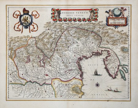 Elegante carta eseguita sul modello di Magini. Willem Janszoon Blaeu, avviò nel 1599 la sua attività di costruttore di globi e strumenti astronomici ad Amsterdam. Nel 1630, dopo aver comprato alcune lastre dell’atlante del Mercator da Jodocus Hondius II, fu in grado di pubblicare un volume di 60 mappe con il titolo di ' Atlantis Appendix. Cinque anni dopo, pubblicò i primi due volumi del suo atlante ' Atlas Novus ' o ' Theatrum Orbis Terrarum, ' in sei libri. Dopo la sua morte, Joan (Johannes) continuò l’opera paterna, completando l’intera serie di sei volume dell’Atlas Novus ' intorno al 1655. Fu inoltre autore di un ' Atlas Maior sive Cosmographia Blaviana, in 12 volumi pubblicati nel 1662 -72, dei quali uno dedicato all'Italia. Per le carte dell’Italia sia Willem Janszoon prima, che Johannes Blaeu poi, si basarono sull’opera di Giovanni Antonio Magini, pubblicata in ' L’Italia ' a cura di Fabio Magini, edito postumo a Bologna nel 1620. La carta compare per la prima volta nel ' Novus Atlas ' di W.J. Blaeu, stampato ad Amsterdam nel 1633 ' cfr. Koeman, ' Atlas Neerlandici, pp. 80-89, Bl 4). Incisione in rame, bella coloritura coeva con ritocchi, in ottimo stato di conservazione. Striking wide margined example of Blaeu's decorative map of the Gulf of Venice and contiguous parts of Italy and Carniola.Extends to Ravenna in the South and shows Venice, Udine, Trieste, Trento, Mantua, Milan, Crema, Bologna, Ferrara, Reggio, Pavia, Bergamo, Tirolo and Brescia. Includes sailing ships, compass rose and 3 cartouches. Willem Janszoon Blaeu, started in 1599 his business as a builder of globes and astronomical instruments in Amsterdam. In 1630, after buying some plates of the Mercator atlas from Jodocus Hondius II, he was able to publish a volume of 60 maps under the title ' Atlantis Appendix. Five years later, he published the first two volumes of his atlas ' Atlas Novus ' or ' Theatrum Orbis Terrarum, in six books. After his death, Joan (Johannes) continued his father's work, completing the entire six-volume ' Atlas Novus ' series around 1655. He was also the author of an ' Atlas Maior sive Cosmographia Blaviana, in 12 volumes published in 1662 -72, one of which was devoted to Italy. For the maps of Italy both Willem Janszoon first, and then Johannes Blaeu, were based on the work of Giovanni Antonio Magini, published in ' L'Italia a cura di Fabio Magini, printed posthumously in Bologna in 1620. Striking example, from the edition of Blaeu's Atlas Novus, published in 1634. ' Copperplate, fine original colouring, in good conditions. Cfr.