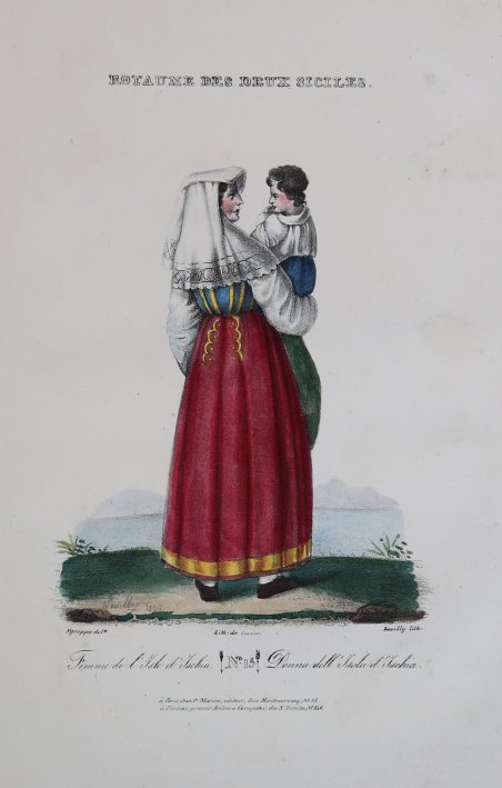 Litografia originale di Levilly su disegno di Sgroppo, tratta dalla rara raccolta Royaume des Deux Siciles. Costumes. Dessines sur lieux, edita a Parigi da P. Marino nel 1826. L'opera presenta il titolo in francese e in italiano perché veniva stampata e venduta anche a Firenze presso l'editore Antonio Campani. Non si hanno altre notizie sul disegnatore Sgroppo. ' Litografia con bellissima coloritura d'epoca, in buone condizioni. ' Non comune. Original lithograph by Levilly from a drawing by Sgroppo, taken from the rare collection Royaume des Deux Siciles. Costumes. Dessines sur lieux, published in Paris by P. Marino in 1826. The title is in French and Italian because it was also printed and sold in Florence by the publisher Antonio Campani. There is no other information on the illustrator Sgroppo. ' Lithograph with beautiful original colouring, in good condition. ' Uncommon. Cfr.