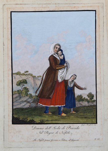 Scena di costume popolare tratta dal raro Raccolta di Varie vestiture che costumano nell Città, Terre e Paesi in Provincie diverse del Regno di Napoli, edito a Napoli da Nicola Gervasi e Vincenzo Talani nel 1793. L'opera è composta da 60 tavole, incise in rame e finemente colorate a mano, tratte da disegni di Alessandro e Olivo d'Anna, incisi da Secondo Bianchi, Antonio Zaballi e Giuseppe Morghen. Le opere circolarono prima sciolte a Roma, dove furono incise, nel 1791/2; successivamente, nel 1793, furono concessi, agli editori Gervasi e Talani, i diritti per la pubblicazione. Tuttavia, siccome venivano poste in commercio opere non provenienti dalla Real Fabbrica, nel 1795 fu stabilito un monopolio che proibiva la vendita di immagini di costumi popolari. Magnifica coloritura coeva, leggere bruniture ai margini, per il resto in buono stato di conservazione. Scene of popular costume taken from the rare Raccolta di Varie vestiture che costumano nell Città, Terre e Paesi in Provincie diversi del Regno di Napoli, published in Naples by Nicola Gervasi and Vincenzo Talani in 1793. The work consists of 60 plates, engraved in copper and finely colored by hand, taken from drawings by Alessandro and Olivo d'Anna, engraved by Secondo Bianchi, Antonio Zaballi and Giuseppe Morghen. ' Magnificent coeval coloring, light browning in the margins, otherwise in good condition. Cfr. Brunet IV, 1075; Colas 2468; Vinet 2303