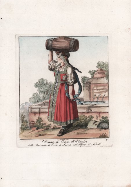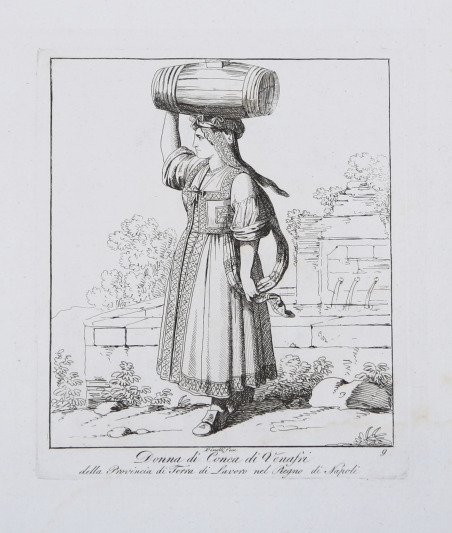 Costume popolare tratto dalla rara Raccolta di 50 costumi li più interessano delle città, terre e paesi in province diverse del Regno di Napoli, stampata a Roma nel 1814. ' Incisione in rame, finemente colorata a mano, in ottimo stato di conservazione. Rara. ' From the rare series ' Raccolta di 50 costumi li più interessano delle città, terre e paesi in province diverse del Regno di Napoli, printed in Rome in 1814. ' Copperplate with fine later hand colour, in excellent condition. Rare. Cfr.