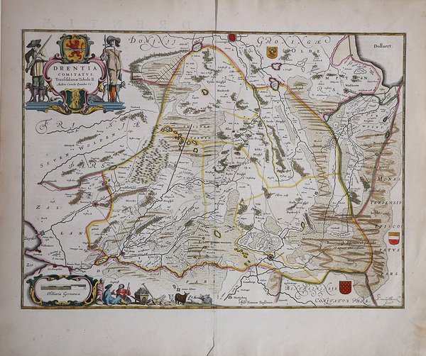 Mappa della regione di Drent, tratta dall'edizione degli eredi Janssonius dell'Atlas Novus, dopo il 1656. Joannes Janssonius (Arnhem, 1588-1664), son of the Arnhem publisher Jan Janssen, married Elisabeth Hondius, daughter of Jodocus Hondius, in Amsterdam in 1612. After his marriage, he settled down in this town as a bookseller and publisher of cartographic material. In 1618 he established himself in Amsterdam next door to Blaeu’s book shop. He entered into serious competition with Willem Jansz. Blaeu. His activities not only concerned the publication of atlases and books, but also of single maps and an extensive book trade with branches in Frankfurt, Danzig, Stockholm, Copenhagen, Berlin, Koningsbergen, Geneva, and Lyon. In 1631 he began publishing atlases together with Henricus Hondius. In the early 1640s Henricus Hondius left the atlas publishing business completely to Janssonius. Competition with Joan Blaeu, Willem’s son and successor, in atlas production prompted Janssonius to enlarge his Atlas Novus finally into a work of six volumes, into which a sea atlas and an atlas of the Old World were inserted. After the death of Joannes Janssonius, the shop and publishing firm were continued by the heirs under the direction of Johannes van Waesbergen (c. 1616-1681), son-in-law of Joannes Janssonius. The copperplates from Janssonius’s atlases were afterwards sold to Schenk and Valck. Incisione in rame, coloritura coeva, in ottime condizioni. Molto decorativa. Decorative map of Drent's area. Taken from 'Atlas Contractus', a two-volume atlas, published two years after Jansson's death by his son-in-law, Jan Jansson van Waesbergen. Latin text. Joannes Janssonius, figlio dell'editore di Arnhem Jan Janssen, sposò Elisabeth Hondius, figlia di Jodocus Hondius, ad Amsterdam nel 1612. Dopo il suo matrimonio, si stabilì in questa città come libraio ed editore di materiale cartografico. Nel 1618 si stabilì ad Amsterdam accanto alla libreria di Willem Jansz. Blaeu, entrando in una seria competizione. Le sue attività non riguardavano solo la pubblicazione di atlanti e libri, ma anche di mappe singole e un vasto commercio di libri con filiali a Francoforte, Danzica, Stoccolma, Copenaghen, Berlino, Koningsbergen, Ginevra e Lione. Nel 1631 iniziò a pubblicare atlanti insieme a Henricus Hondius. Nei primi anni 1640 Henricus Hondius lasciò l'attività di pubblicazione di atlanti completamente a Janssonius. La concorrenza con Joan Blaeu, figlio e successore di Willem, nella produzione di atlanti spinse Janssonius ad ampliare il suo Atlas Novus finalmente in un'opera di sei volumi, in cui furono inseriti un atlante marino e un atlante del Vecchio Mondo. Dopo la morte di Joannes Janssonius, il negozio e la casa editrice furono continuati dagli eredi sotto la direzione di Johannes van Waesbergen (c. 1616-1681), genero di Joannes Janssonius. Le matrici degli atlanti di Janssonius furono in seguito vendute a Schenk e Valck. Cfr. KOEMAN: Me 184 & 185