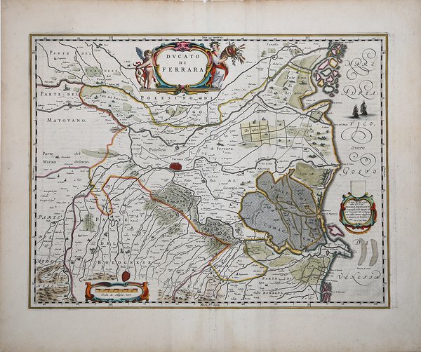 La carta del territorio ferrarese di Johannes Blaeu è edita per la prima volta nell'edizione francese del Le Theatre du Monde del 1640. Successivamente viene usata per tutte le edizione degli atlanti del Blaeu. Esemplare tratto dall'edizione olandese del Theatrum del Blaeu, che prende il nome di Toonneel des Aerdrijcx oft Nieuwe Atlas, 1642. Willem Janszoon Blaeu, avviò nel 1599 la sua attività di costruttore di globi e strumenti astronomici ad Amsterdam. Nel 1630, dopo aver comprato alcune lastre dell’atlante del Mercator da Jodocus Hondius II, fu in grado di pubblicare un volume di 60 mappe con il titolo di ' Atlantis Appendix. Cinque anni dopo, pubblicò i primi due volumi del suo atlante ' Atlas Novus ' o ' Theatrum Orbis Terrarum, ' in sei libri. Dopo la sua morte, Joan (Johannes) continuò l’opera paterna, completando l’intera serie di sei volume dell’Atlas Novus ' intorno al 1655. Fu inoltre autore di un ' Atlas Maior sive Cosmographia Blaviana, in 12 volumi pubblicati nel 1662 -72, dei quali uno dedicato all'Italia. La carta compare per la prima volta nel terzo volume del ' Theatrum. ' Secondo Koeman viene pubblicata in primis nell'edizione francese del 1640, dal titolo ' Le Theatre du Monde ou Nouvel Atlas, ' Mis en lumiere par Guillaume & Jean Blaeu. ' Troisieme partie. A Amsterdam, Chez Iean & Corneille Blaeu MDCXL. Il terzo volume del ' Theatrum ' contiene 58 carte dell'Italia e 4 della Grecia (cfr. Koeman, ' Atlas Neerlandici, pp. 160-162, Bl 35A). Le carte dell'italia derivano tutte dall'opera di Giovanni Antonio Magini. Tuttavia, sembra più probabile che il Blaeu si basi sue quelle di Hendrick Hondius e Johannes Janssonius pubblicate nel ' Theatrum Italiae in quo Eius Regna, Domina, Ducatus, Et Speciatim Illorum Provinciae, Tabulis Accuratissimis, Iam, De Novo in Lucem Editio, Describunter, Quorum Sequens Pagina Indicabit, stampato ad Amsterdam da Hendrick Hondius nel 1636. ' Sebbene pubblicate dopo la morte di Willem Janszoon Blaeu (1638) le carte spesso recano il suo imprint. Non è dato sapere se fossero tutte già pronte o se i figli Johannes e Cornelis le compilarono postume. Incisione in rame, coloritura coeva, in ottimo stato di conservazione. Bibliografia Koeman Bl 38A, 249; ' A. Alberghini (a cura di) "Ferrara." p. 34. Striking wide margined example of Blaeu's decorative map of ' Ferarra. Willem Janszoon Blaeu, started in 1599 his business as a builder of globes and astronomical instruments in Amsterdam. In 1630, after buying some plates of the Mercator atlas from Jodocus Hondius II, he was able to publish a volume of 60 maps under the title ' Atlantis Appendix. Five years later, he published the first two volumes of his atlas ' Atlas Novus ' or ' Theatrum Orbis Terrarum, in six books. After his death, Joan (Johannes) continued his father's work, completing the entire six-volume ' Atlas Novus ' series around 1655. He was also the author of an ' Atlas Maior sive Cosmographia Blaviana, in 12 volumes published in 1662 -72, one of which was devoted to Italy. The map first appears in the third volume of the Theatrum. According to Koeman it is first published in the French edition of 1640, entitled Le Theatre du Monde ou Nouvel Atlas, Mis en lumiere par Guillaume & Jean Blaeu. Troisieme partie. In Amsterdam, Chez Iean & Corneille Blaeu MDCXL. The third volume of the Theatrum contains 58 maps of Italy and 4 of Greece (see Koeman, Atlas Neerlandici, pp. 160-162, Bl 35A). The maps of Italy are all derived from the work of Giovanni Antonio Magini. However, it seems more likely that Blaeu relies on those of Hendrick Hondius and Johannes Janssonius published in Theatrum Italiae in quo Eius Regna, Domina, Ducatus, Et Speciatim Illorum Provinciae, Tabulis Accuratissimis, Iam, De Novo in Lucem Editio, Describunter, Quorum Sequens Pagina Indicabit, printed in Amsterdam by Hendrick Hondius in 1636. Although published after the death of Willem Janszoon Blaeu (1638) the maps often bear his imprint. It is not known whether they were all ready-made or if his sons Johannes and Cornelis completed them posthumously. Copperplate, in very good conditions. Cfr.