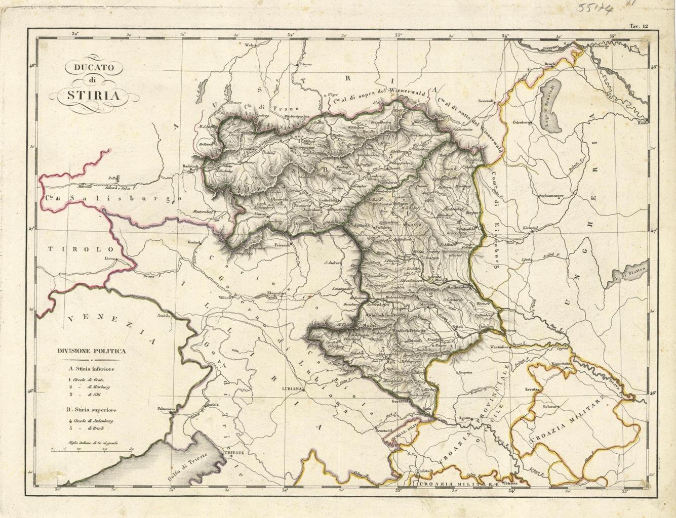 Carta geografica, antica ed originale con coloritura coeva ai confini. Milano, dall’Imperiale Regia Stamperia 1833. Autore: Marieni Giovanni trad. & A. Campana dir. Luogo: Austria - Stiria. Anno: 1833. Tecnica: incisione in rame. Dimensioni: 288x390 mm.
