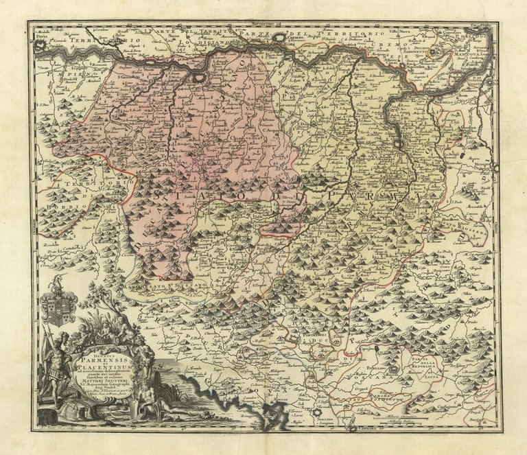 Carta geografica, entro margine graduato, raffigurante il territorio del Ducato di Parma e Piacenza. L'orografia è trattata a coni di talpa con illuminazione da ovest. L'idrografia risulta attenta visto il disegno dei maggiori affluenti del Po, mentre in merito alla strade troviamo indicati solo le maggiori. Nell'angolo in basso a sinistra trova spazio un ampio ed animato cartiglio in cui si trova iscritto il titolo. Interessante è la sua composizione che grazie alle varie figure allegoriche dichiara l'ubertosità del territorio. Il tutto è sormontato dallo stemma dell'ultimo discendente della famiglia Farnese, Antonio. A partire dal 1731, alla morte di quest'ultimo, lo stemma venne abolito ed inseguito al matrimonio tra Elisabetta Farnese e Filippo V di Spagna, questo passerà in eredità ai Borbone. L'incisione è caratterizzata da coloritura confinale all'acquerello coeva. Piega centrale editoriale. Molto buono lo stato di conservazione generale. Foglio ancora in barbe.