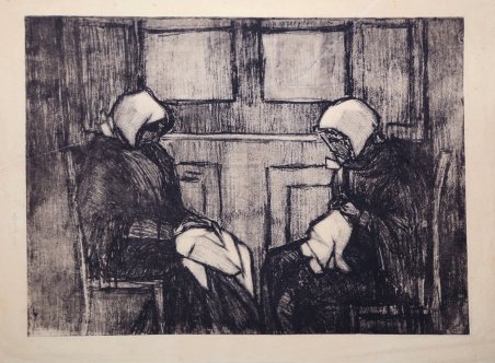 Vernice mole, circa 1900, priva di firma. Bellissima prova, impressa su carta avorio, con margini, lieve piega di carta obliqua, pe ril resto in ottimo stato di conservazione. L’opera fa parte dei celebri ritratti di donne bretoni, principalmente fonti di pittura ma anche soggetto di acqueforti, puntesecche e litografie. Charles Cottet, di impostazione post-impressionista ma di orientamento chiaramente naturalista, fu uno dei fondatori del gruppo della "Bande noire". Nel 1886 fece il suo primo viaggio in Bretagna. Viaggiò a piedi e scoprì per prima la penisola di Crozon, percorrendola tutta. Quelle terre e quel mare lo ispirarono particolarmente ed egli iniziò a tornarvi ogni anno per diverso tempo a dipingere paesaggi e persone. Per molte volte soggiornò anche nell'isola di Ouessant. In quel periodo, con il titolo di "Il paese del mare", completò una serie di quadri che illustravano gli aspetti più caratteristici e pittoreschi della rude vita dei pescatori. Dal 1900 al 1910 Cottet fece parte e contribuì a formare un gruppo di artisti soprannominato "Banda nera", a causa delle critiche che essi formulavano nei confronti della grande luminosità delle opere impressioniste. Ne facevano parte, fra gli altri, Lucien Simon, Edmond Aman-Jean, André Dauchez, George Desvallières e Maurice Denis. La tavolozza di questi pittori - più o meno influenzati dal realismo e dalle tinte severe di Gustave Courbet - e quindi anche la gamma cromatica di Cottet, era di fatto composta da tinte scure, ombrose, a volte persino cupe, o comunque tutt'altro che sgargianti. Le visioni della Bretagna contadina di Cottet appaiono serotine e terrose, e le sue marine mostrano sempre cieli corrucciati. Le sue composizioni, però, non risultano mai tristi, bensì pensose, riflessive, forse consapevoli. Eccezionali, e quindi anche particolarmente felici, appaiono pertanto gli squarci di sole sui muri bianchi delle case e nei paesaggi dai vasti cieli, sempre assai moderatamente luminosi. Della gente Cottet colse spesso aspetti intensi, come il dolore, il lutto, la riservatezza. Rara. Soft paint, circa 1900, unsigned. Beautiful proof, printed on cream paper, with margins, slight paper crease oblique, otherwise in excellent condition. The work is part of the famous portraits of Breton women, mainly sources of painting but also subject of etchings, drypoints and lithographs. Charles Cottet (12 July 1863 – 30 September 1925) was a French painter, born at Le Puy-en-Velay and dead in Paris. A famed post-impressionist, Cottet is known for his dark, evocative painting of rural Brittany and seascapes. He led a school of painters known as the Bande noire or 'Nubians' group (for the sombre palette they used, in contrast to the brighter Impressionist and Postimpressionist paintings) and was friends with such artists as Auguste Rodin. Cottet studied at the École des Beaux-Arts, and under Puvis de Chavannes and Roll, while also attending the Académie Julian (where fellow students formed Les Nabis school of painting, with which he was later associated). He travelled and painted in Egypt, Italy, and on Lake Geneva, but he made his name with his sombre and gloomy, firmly designed, severe and impressive scenes of life on the Brittany coast. Cottet exhibited at the Salon of 1889, but on a trip to Brittany in 1886 he had found his true calling. For the next twenty years he painted scenes of rural and harbor life, portraying a culture Parisians still found exotic. He is especially noted for his dark seascapes of Breton harbors at dawn, and evocative scenes from the lives of Breton fishermen. He was close friends with Charles Maurin, and his group included the painter Félix-Émile-Jean Vallotton. Cottet has often been associated with the picturesque seaside symbolism of the Pont-Aven School, though Vallotton famously painted Cottet as a leader of Les Nabis, beside Pierre Bonnard, Édouard Vuillard, and Ker-Xavier Roussel, in his Five Painters (1902-3; Kunstmuseum Winterthur). Cottet was more explicitly the leader of his own small movement, the Bande noire of the 1890s, which included Lucien Simon and André Dauchez, all influenced by the realism and dark colours of Courbet. Rare. Cfr.