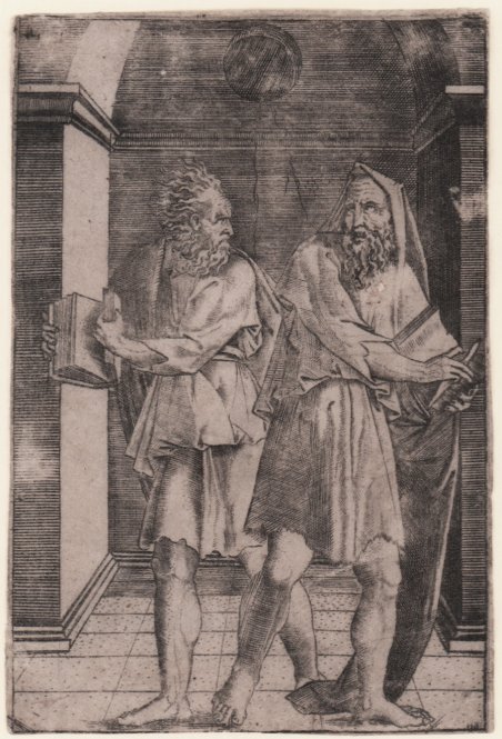 Bulino, 1515-30 circa, privo di firma e dati editoriali.Da un soggetto di Baccio Bandinelli.Bellissima prova, impressa su carta vergata coeva priva di filigrana, rifilata al rame, in perfetto stato di conservazione.La scena rappresenta due anziani filosofi, ciascuno con un libro nelle mani, con una posizione reciproca dei corpi che indica un voler prendere distanza l’uno dall'altro, forse a ' significare due ideologie diverse.Bartsch suppone che l’incisione derivi da un disegno attribuito a Baccio Bandinelli. Agostino de Musi, detto Agostino Veneziano, nacque in Veneto, forse a Venezia, intorno al 1490, periodo fissato approssimativamente dagli studiosi in base alle date più antiche incise su alcune stampe. Si recò a Roma nel 1515/16, dove entrò in rapporto con Marcantonio Raimondi, divenendone, insieme a Marco Dente, uno dei principali alfieri e poi collaboratori nella "ditta" Raimondi, la prima vera e propria impresa artistico-commerciale impegnata nella riproduzione di soggetti raffaelleschi. Ad un periodo, fino al 1520, di intensa attività della bottega di Marcantonio seguirono probabilmente anni più difficili dovuti alla morte di Raffaello nel 1520 e all'imprigionamento dello stesso Raimondi intorno al 1523-24 per aver inciso alcuni soggetti lascivi. ' Il sacco di Roma del 1527 spinse il De Musi a lasciare la città, verso Mantova, attratto da Giulio Romano. La produzione incisoria di Agostino è assai vasta e consistente numericamente, soprattutto se rapportata al breve arco di tempo in cui fu realizzata, all'incirca tra il 1514 e il 1536. Alle 139 incisioni riportate dal Bartsch sono da aggiungere le nuove 4 citate dal Passavant e le 8 riportate dallo Heinecken: si tratta di bulini tutti firmati o contrassegnati dal monogramma, a volte costituito da lettere normali, a volte da caratteri gotici; a queste opere sono da aggiungere anche un gruppo di circa 60 bulini anonimi di probabile o dubbia attribuzione. L'opera è rarissima. Engraving, circa 1515-30, without date and signature.After Baccio Bandinelli.A fine impression, printed on contemporary laid paper, trimmed to the platemark, very good condition.The scene depicts two old philosophers holding open books, walking away from each other as if in anger; a windowed niche in background.Bartsch suggests that this engraving was done after a drawing attributed to Baccio Bandinelli. Agostino de Musi, known as Agostino Veneziano, was born in the Veneto, possibly in Venice, around 1490, a period set approximately by scholars based on the earliest dates engraved on some prints. He went to Rome in 1515/16, where he entered into a relationship with Marcantonio Raimondi, becoming, along with Marco Dente, one of his principal pupil and later collaborators in the Raimondi “firm,” the first real artistic-commercial enterprise engaged in the reproduction of Raphaelesque subjects. A period, until 1520, of intense activity in Marcantonio's workshop was probably followed by more difficult years due to Raphael's death in 1520 and the imprisonment of Raimondi himself around 1523-24 for engraving some lascivious subjects. The Sack of Rome in 1527 prompted De Musi to leave the city, heading for Mantua, attracted by Giulio Romano. The collaboration with Giulio coincided with a period characterized by high artistic achievements and intense production, dating from the years 1530-1532. ' Agostino's engraving production is very large and numerically consistent, especially when compared to the short time span in which it was produced, roughly between 1514 and 1536. To the 139 engravings reported by Bartsch must be added the new 4 cited by Passavant and the 8 reported by Heinecken: these are all signed or monogrammed engravingss, sometimes consisting of normal letters, sometimes of Gothic characters; to these works must also be added a group of about 60 anonymous enrgavings of probable or doubtful attribution. A very rare work. Cfr. Bartsch XIV.330.439.