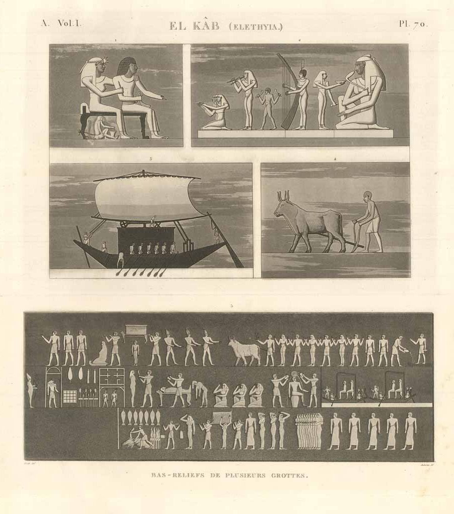 Decorazioni raffiguranti scene di vita quotidiana di alcuni bassorilievi della Necropoli di El Khab. Incisione all’acquaforte su lastra di rame, inserita nella monumentale opera Description de l’Egypte, II° edizione dal 1820-29 voluta da Luigi XVIII, importante risultato culturale dell’occupazione francese in Egitto per il periodo che va dal 1798 al 1801. Bonaparte decise di invadere queste terre per controllare le vie commerciali verso l’india ed assestare in questo modo un duro colpo all’economia britannica. Durante questa operazione, il Nostro favorì l’attività di numerosi artisti, ingegneri, matematici e naturalisti per registrare e catalogare con estrema precisione le costruzioni e i monumenti egiziani nonché la flora e la fauna. Il risultato di questo immane sforzo, che per la pubblicazione coinvolse quasi duemila tra artisti e tecnici oltre a quattrocento incisori, fu l’opera "Description de l’Egypte, ou recueil des observations et des recherches qui ont été faites en Egypte pendant l’expédition de l’armée française", che offre una globale visione scientifica dell’antico e moderno Egitto, nonché la sua storia naturale. La Description ebbe grande influenza sul movimento orientalista pittorico dell’ottocento e diede un contributo fondamentale alla diffusione dell’Egittologia. Numerosi edifici rappresentati in queste tavole sono stati completamente distrutti nel tempo.
