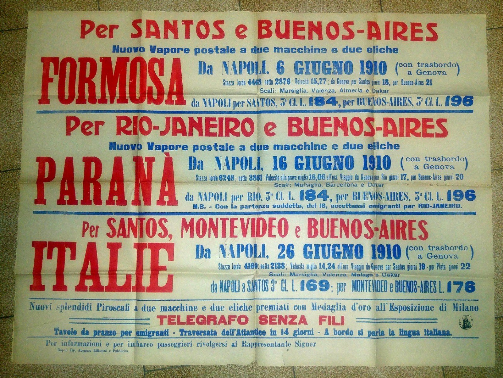 EMIGRAZIONE manifesto 1910 Napoli Santos Formosa grandi dimensioni EMIGRANTI