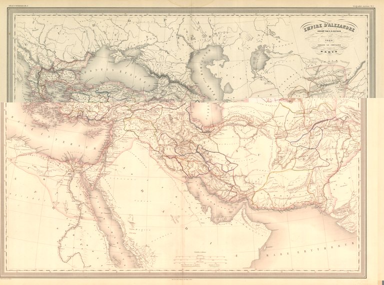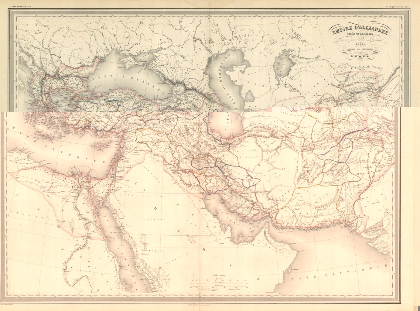 Carta geografica, antica ed originale, con coloritura coeva ai confini. Mappa inserita nell'opera "Atlas Universel Physique, Historique et Politique de Géographie Ancienne et Moderne. composé et dressé par H. Dufour gravé sur acier par Ch. Dyonnet" edita a Parigi dagli editori Paulin e Le Chevalier nel 1860. Autore: Dufour scrisse & Ch. Dyonnet inc. Luogo: Impero di Alessandro Magno. Anno: 1860. Tecnica: incisione in acciaio. Dimensioni: 550x748 (585x813 mm il foglio).