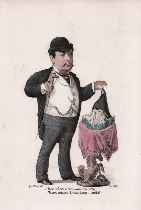 Litografia con coloritura coeva, 1877 circa, firmata in basso ' A. Manganaro. Tavola della celebre serie “Il Palazzo S. Giacomo, Album degli 80 al Municipio di Napoli 1876 e 1877” raccolta di immagini satiriche raffiguranti i rappresentanti dell’amministrazione comunale di Napoli. Vengono effigiate, pertanto, le più importanti figure comunali; giudici, avvocati, architetti, geometri, marittimi etc. sono disegnati con tratti caricaturali e associati con chiari elementi che contraddistinguono la loro professione. Nel 1877 Antonio Manganaro (Manfredonia 1842 – Napoli 1921), uno dei più celebri disegnatori satirici della Napoli della seconda metà del ‘800, dà alle stampe le tavole litografate a colori de ' Il Palazzo S. Giacomo Album degli 80 al Municipio di Napoli 1876 e 1877 ' che ritraggono con tratti caricaturali i rappresentanti dell’amministrazione comunale partenopea di quegli anni. Sul retro di ogni tavola un’ironica biografia racconta le vicende umane e professionali del personaggio raffigurato. Nella copertina dell’Album degli 80 ' ad accogliere il lettore è Ferdinando Ramognini, Delegato Straordinario (oggi si direbbe Commissario) del Municipio di Napoli, nominato dal governo il 1° maggio 1876, a seguito dello scioglimento del consiglio comunale. Di origini liguri, Ramognini (1829 – 1898) era stato uomo di fiducia di Cavour che ne aveva favorito la carriera in ambito governativo. Prima e dopo l’esperienza commissariale napoletana, terminata nel luglio del 1876, fu prefetto in varie città italiane e senatore del Regno d’Italia dal 1892 fino alla morte. L’uomo politico è ritratto da Manganaro in un elegante abito scuro su cui fa bella mostra l’onorificenza di Casa Savoia mentre apre una tenda come un sipario teatrale per mostrare l’entrata in Palazzo San Giacomo del Sindaco Gennaro Sambiase Sanseverino Duca di San Donato con la sua mole poderosa, icona inconfondibile della politica napoletana postunitaria, seguito da consiglieri. ' ' ' ' ' ' ' ' ' ' ' ' Tra le ottanta divertenti caricature dei rappresentanti comunali, tutti argutamente descritti con le proprie particolari caratteristiche fisiognomiche e con sottotitoli che in brevi motti ne sintetizzano l’occupazione o l’indole, va menzionata quella di Camillo Minieri Riccio (Napoli 1813 – ivi 1882), autore di importanti testi sulla storia della dominazione angioina e in generale del regno napoletano. Lo studioso ebbe incarichi di prestigio quali la direzione della Biblioteca di San Giacomo (1863), la nomina di rappresentante della Commissione Municipale per la conservazione dei monumenti (1869) e la direzione dell’Archivio di Stato di Napoli (1874). Nel disegno di Manganaro l’anziano consigliere, a testimonianza dei suoi precipui interessi di studio, è ritratto in una disordinata biblioteca, appollaiato sulla cima di uno scaletto, immerso nella lettura di un grosso volume circondato da altri libri poggiati sui pioli, pronti per essere consultati. ' ' ' ' ' ' ' ' ' ' ' ' Con la sua graffiante matita Manganaro, come altri celebri caricaturisti attivi in quegli anni a Napoli, quali Melchiorre de Filippis Delfico, Enrico Colonna e Mario Buonsollazzi in arte Solatium, prendendo spunto dagli avvenimenti quotidiani, mette alla berlina, ma con garbo ed eleganza, noti personaggi del mondo della politica e della cultura su Album, strenne illustrate e soprattutto giornali satirici come ' L’Arca di Noè, Il bello Gasparre .e basta così, Il Caporal terribile., ' assai diffusi all’indomani dell’Unità d’Italia. In particolare, furono ricercatissime le caricature pubblicate in ' Montecitorio Album dei 500 ' (1872-1874), nel volume ' Consiglio Provinciale di Napoli ' (1880) con gustose caricature di ministri e parlamentari e dei consiglieri provinciali e nell’Album A zonzo ' per le sale dell’Esposizione di Belle Arti di Napoli ' (1877) in cui prende in giro gli artisti del suo tempo. Lithograph with contemporary coloring, circa 1877, signed at bottom ' A. Manganaro. Plate from the famous series ““Il Palazzo S. Giacomo, Album degli 80 al Municipio di Napoli 1876 e 1877” collection of satirical images depicting representatives of the municipal administration of Naples. The most important municipal figures are portrayed; judges, lawyers, architects, surveyors, seafarers etc. are drawn with caricature features and associated with clear elements that distinguish their profession. In 1877 Antonio Manganaro (Manfredonia 1842 - Naples 1921), one of the most famous satirical draughtsmen of Naples in the second half of the 19th century, gave to the presses the color lithographed plates of ' Il Palazzo S. Giacomo Album degli 80 al Municipio di Napoli 1876 e 1877, ' which portray with caricature strokes the representatives of the Neapolitan municipal administration of those years. On the back of each plate, an ironic biography recounts the human and professional events of the person depicted. On the cover of the ' Album degli 80 ' to welcome the reader is Ferdinando Ramognini, Delegato Straordinario (today we would say Commissioner) of the Naples City Hall, appointed by the government on May 1, 1876, following the dissolution of the city council. Of Ligurian descent, Ramognini (1829 - 1898) had been a trusted man of Cavour, who favored his career in government. Before and after his Neapolitan commissarial experience, which ended in July 1876, he was prefect in several Italian cities and senator of the Kingdom of Italy from 1892 until his death. The politician is portrayed by Manganaro in an elegant dark suit on which the honorific of the House of Savoy is beautifully displayed as he opens a curtain like a theatrical curtain to show the entrance into Palazzo San Giacomo of Mayor Gennaro Sambiase Sanseverino Duca di San Donato with his mighty bulk, an unmistakable icon of post-unification Neapolitan politics, followed by councilors. ' ' ' ' ' ' ' ' ' ' ' ' Among the eighty amusing caricatures of 
