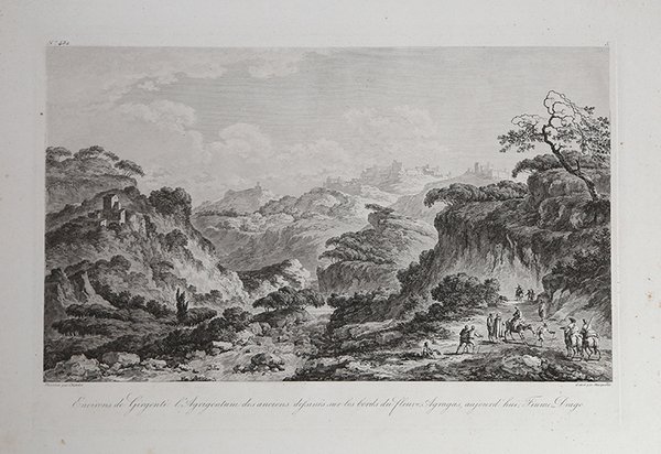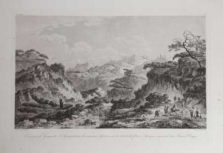 Veduta pubblicata nel ' Voyage Pittoresque ou description des Royaumes de Naples et de Sicile, opera in 5 volumi per la prima volta stampati a Parigi tra 1781 e il 1786. Richard de Saint-Non conobbe, durante il suo viaggio a Roma, i due già celebri pittori francesi Jean Honoré Fragonard e Hubert Robert, con i quali prosegue il suo viaggio per tutto il paese. Da questa grande amicizia nasce l’idea e la collaborazione per l’ambizioso progetto di documentare graficamente tutti i principali monumenti dell’Italia Meridionale e della Sicilia. Da qui, tra il 1781 ed il 1786, con l’aiuto di numerosi ed importanti architetti, pittori ed incisori, venne alla luce il Voyage Pittoresque ou description des Royaume de Naples et de Sicilie, opera composta di cinque volumi che uscirono annualmente. Incredibile sforzo tipografico, l’opera raccoglie quasi per intero gli appunti di viaggio del Saint-Non, adeguatamente assemblati e corretti; il corpus grafico è composto di ben 542 incisioni all’acquaforte e bulino, opera dei principali artisti di riproduzione del periodo. Da un punto di vista editoriale l’iniziativa riscuote immediatamente un grandissimo successo: il libro diviene un vero e proprio modello tipografico, sul quale sono basate diverse pubblicazioni dell’impero napoleonico. Dal punto di vista artistico le vedute, i paesaggi e le rovine conservano, e non può essere altrimenti, lo stile pittorico e romantico del Fragonard, del Robert, del Desprez, e di tutti gli altri artisti che collaborano nella realizzazione di questa monumentale opera. Il notevole successo commerciale della raccolta è testimoniato dalla ristampa, tra il 1795 ed il 1798, delle sole tavole pittoriche. Un’ulteriore edizione è stampata nel 1829 dal Dufour. Esemplare tratto dal ' Voyage Pittoresque, ' seconda edizione del 1795/98, priva dell’indicazione del privilegio reale. ' Acquaforte, stampata su carta vergata coeva, leggere ossidazioni, per il resto in ottimo stato di conservazione. View taken from the Voyage Pittoresque ou description des Royaume de Naples et de Sicilie by Richard de Saint-Non. During his trip to Rome, Richard de Saint-Non met two already famous French painters, Jean Honoré Fragonard and Hubert Robert, with whom he travelled along Italy. Their friendship led to the cooperation for the ambitious project of depicting all the main monuments of Southern Italy and Sicily. Between 1781 and 1786, with the assistance of many contemporary artists, he realized the Voyage Pittoresque ou description des Royaume de Naples et de Sicilie, a five volumes work published annually. As a result of a great typographical effort, the work is a collection of Sain-Non’s travelling notes; the graphic part is made up of 542 engravings and etchings, realized by the most important artists of the period. The work is immediately successful, for the book became a new typographical model for the following publications. From an artistic point of view, the views, landscapes and antiquity keep the Romantic pictorial style of Fragonard, Robert, Desprez and all the other artists that took part in this monumental project. The re-issue, between 1795 and 1798, of the pictorial plates, witnesses the great success of this project. A re-issue of the whole work was edited in 1829 by Dufour. Example taken from the second edition of the work, printed in Paris 1795/98; the plates are without the Royal priviledge. ' Etching, printed on contemporary laid paper, light foxing, otherwise good condition. Cfr.