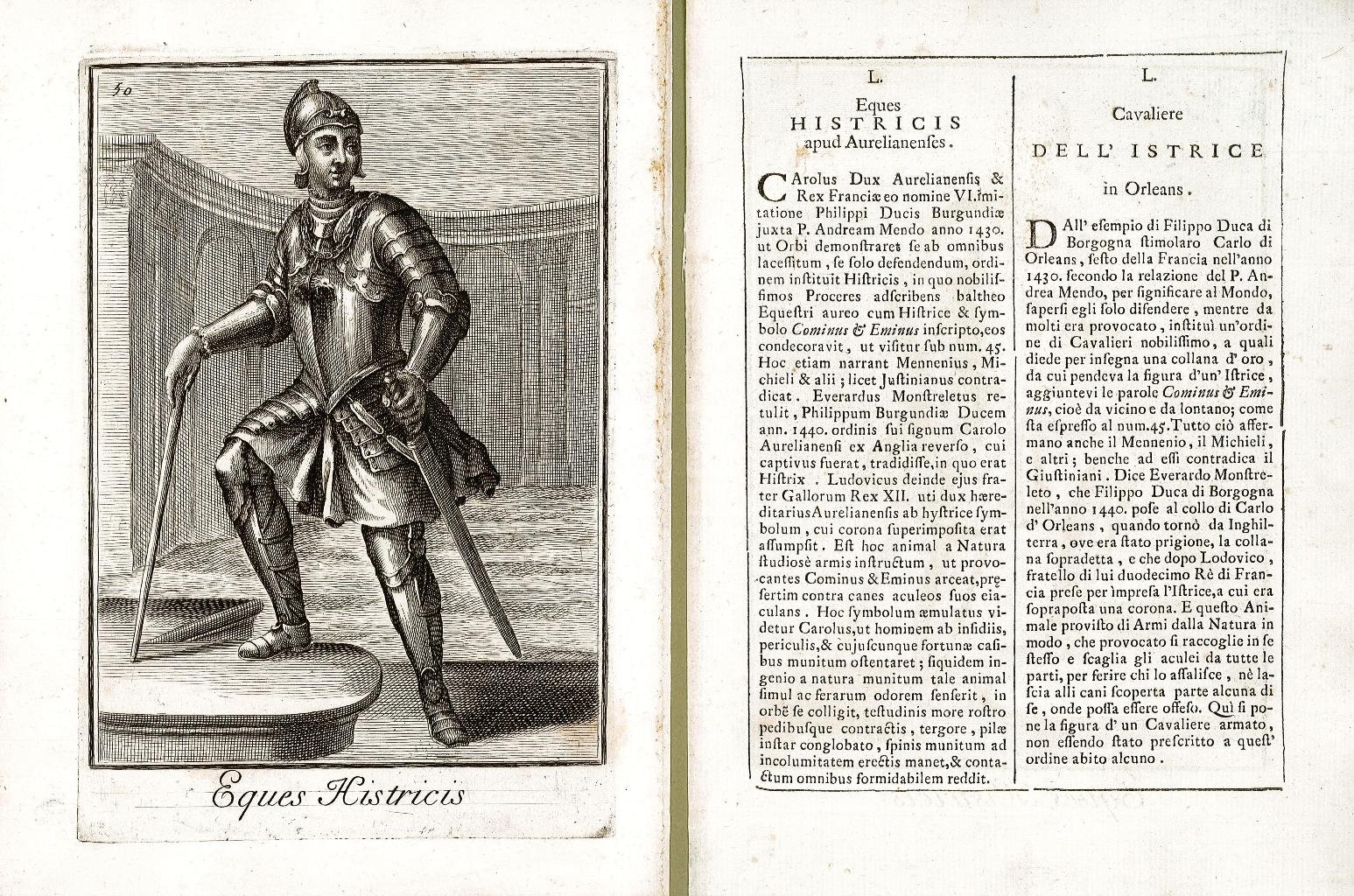 Incisione, antica ed originale, raffigurante il Cavaliere dell'Istrice in orleans accompagnata da pagina descrittiva divisa su due colonne, a sinistra in latino ed a desta in italiano, con la storia del costume dell’ordine militare rappresentato. Inserita nell’opera “Catalogo degli ordini equestri e militari. Esposto in imagini, e con breve racconto offerto alla Santità di N.S. Clemente XI dal P. Filippo Bonanni della Compagnia di Giesu” In Roma MDCCXI – Nella Stamperia di Giorgio Placco Intagliatore, e Gettatore di Caratteri à S. Marco. Con licenza de’ Superiori