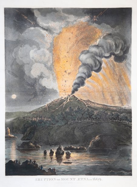 Magnifica tavola raffigurante l’eruzione dell'Etna nel 1669. Acquatinta stampata a colori, realizzata da Thomas Sutherland su disegno di D. Romagni. Pubblicata nel 1809 da Robert John Thornton, nell'opera comunemente chiamata The Philosophy of Botany, il cui titolo completo era Botanical Extracts: or Philosophy of botany, being botanical and philosophical Extracts or Elementary botanical plates, illustrative of the science of botany, but more particularly intended to illustrate Botanical Extracts, or the Philosophy of botany. Le immagini dell’opera derivano da dipinti di Warner, Sydenham Edwards, Peter Henderson e Philip Reinagle. Le tavole sono state prodotte utilizzando i complessi ed innovativi processi di incisione a mezzotinto ed acquatinta a colori. Thomas Sutherland (1785-1838) è stato un incisore ad acquatinta britannico. Oltre a contribuire alle illustrazioni de The Microcosm of London, di Rudolf Ackermann, produsse anche una serie di stampe basate sulla guerra peninsulare. Bella impressione, stampata su carta coeva, in ottimo stato di conservazione. Rara. Bibliografia Blunt, The Art of Botanical Illustration, 1950, pgs. 203-208; Johnston, Clevelands Treasures from the World of Botanical Literature, 1998, pgs. 103-105. Eruption of Mount Etna (Aetna) in 1669. Aquatint printed in colours, made by Thomas Sutherland after a paint by D. Romagni. Published in 1809 by Robert John Thornton, in the ' work commonly called The Philosophy of Botany. The longer full title was Botanical Extracts: or Philosophy of botany, being botanical and philosophical Extracts or Elementary botanical plates, illustrative of the science of botany, but more particularly intended to illustrate Botanical Extracts, or the Philosophy of botany. The images were originallly illustrated by Warner, Sydenham Edwards, Peter Henderson, and Philip Reinagle. The plates were produced using mezzotint and aquatint engraving processes. Thomas Sutherland (1785–1838) was a British engraver and aquatinter. As well as contributing illustrations to Rudolf Ackermann's The Microcosm of London, he also produced a series of prints based on the Peninsular War. A fine impression, very good condition. Rare. Bibliografia Blunt, The Art of Botanical Illustration, 1950, pgs. 203-208; Johnston, Clevelands Treasures from the World of Botanical Literature, 1998, pgs. 103-105. Cfr.