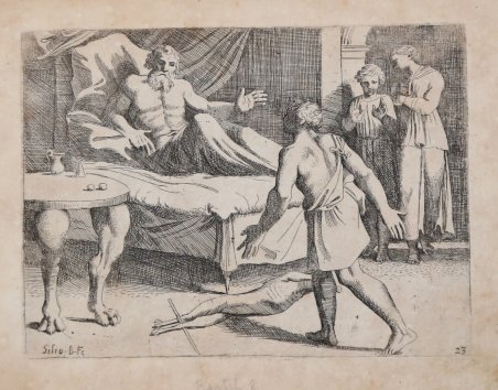 Acquaforte, circa 1607, firmata in lastra. Bellissima prova, con pieni margini, alcuni strappi nei margini bianchi dove sono presenti delle leggere gore d’acqua che non intaccano la parte incisa, per il resto in buono stato di conservazione. La tavola appartiene alla famosa Bibbia di Raffaello, incisa da Sisto Badalocchio e Giovanni Lanfranco, dal titolo Historia del Testamento Vecchio dipinta in Roma nel Vaticano da Raffaello da Urbino et intagliata in rame da Sisto Badalocchi et Giovanni Lanfranchi Parmigian. Al Sig. Annibale Carracci. In Roma appresso a Giovanni Orlandi. Con licenza de' Superiori. 1607. La serie fu realizzata intorno al 1607 a Roma, dove i due artisti erano allievi di Annibale Carracci; 28 delle tavole sono incise da Lanfranco, 23 da Badalocchio. Le opere derivano dagli affreschi di Raffaello nella loggia del Vaticano. Scrive Michael Bury in The Print in Italy, BM 2001, cat.90: “The etchings reverse Raphael's compositions. Mussini noted a tendency to simplification and alteration, especially in Badalocchio (Mussini, 1979, p.61); Borea suggested that the prints are the result of some critical reflection (1986, p.xvi). In the plate shown here, the spatial structure is substantially altered by cutting the height of the scene, making Isaac's head almost touch the top edge. This is in line with what is done in many others, by Sisto Badalocchio as well as Lanfranco. The effect is to increase the size and impact of the figures, for it is their movements and their relationships with one another that are at the centre of attention. The long dedication to Annibale Carracci reveals that the drawings had been made during the previous summer, while the Pope was away from the Vatican. Annibale's illness had prevented Badalocchio and Lanfranco from studying with him, and, keen to pursue their studies during this period, they had turned to the work of Raphael, whom Annibale always praised so much. They had now decided to publish their drawings for the benefit of young students of painting who live far away, executing them in etching 'for greater speed' ("per maggiore prestezza"). It is pointed out that not everyone has appreciated the Loggie frescoes as much as they deserve, believing them to have only been designed by Raphael; however for the variety of the inventions and for their sublime subjects they are worthy of the highest regard. Ginzburg Carignani (1996, p.130 and n.112) has shown that the preface was not in fact written by the two pupils, but by G.B.Agucchi (1570-1632) the patron and writer on art. Agucchi was a great champion of the Carracci and of Annibale in particular, seeing them as the reformers who had restored painting to the true path marked out first by the ancients and then, in modern times, by Raphael”. Plate of the Raphael Bible etched by Badalocchio and Lanfranco, titled Historia del Testamento Vecchio dipinta in Roma nel Vaticano da Raffaello da Urbino et intagliata in rame da Sisto Badalocchi et Giovanni Lanfranchi Parmigian. Al Sig. Annibale Carracci. In Roma appresso a Giovanni Orlandi. Con licenza de' Superiori. 1607. The series consists of 54 plates, a frontispiece and three etched plates with dedicatory text to Annibale Carracci and 50 plates after Raphael that are numbered from 5 to 54. The set was made when the two etchers were both young pupils of Carracci in Rome in 1607 and were said to have been made to try to lift him out of depression; 28 plates are by Lanfranco (Bartsch XVIII.345.1 to 28) and 23 (including the frontispiece) by Badalocchio (Bartsch XVIII.354.1 to 23). From Michael Bury, The Print in Italy, BM 2001, cat.90: “The etchings reverse Raphael's compositions. Mussini noted a tendency to simplification and alteration, especially in Badalocchio (Mussini, 1979, p.61); Borea suggested that the prints are the result of some critical reflection (1986, p.xvi). In the plate shown here, the spatial structure is substantially altered by cutting the height of the scene, making Isaac's head almost touch the top edge. This is in line with what is done in many others, by Sisto Badalocchio as well as Lanfranco. The effect is to increase the size and impact of the figures, for it is their movements and their relationships with one another that are at the centre of attention. The long dedication to Annibale Carracci reveals that the drawings had been made during the previous summer, while the Pope was away from the Vatican. Annibale's illness had prevented Badalocchio and Lanfranco from studying with him, and, keen to pursue their studies during this period, they had turned to the work of Raphael, whom Annibale always praised so much. They had now decided to publish their drawings for the benefit of young students of painting who live far away, executing them in etching 'for greater speed' ("per maggiore prestezza"). It is pointed out that not everyone has appreciated the Loggie frescoes as much as they deserve, believing them to have only been designed by Raphael; however for the variety of the inventions and for their sublime subjects they are worthy of the highest regard. Ginzburg Carignani (1996, p.130 and n.112) has shown that the preface was not in fact written by the two pupils, but by G.B.Agucchi (1570-1632) the patron and writer on art. Agucchi was a great champion of the Carracci and of Annibale in particular, seeing them as the reformers who had restored painting to the true path marked out first by the ancients and then, in modern times, by Raphael. Etching, printed on contemporary laid paper, with full margins showing tears at waterstains, otherwise good condition. Cfr. TIB.40.8