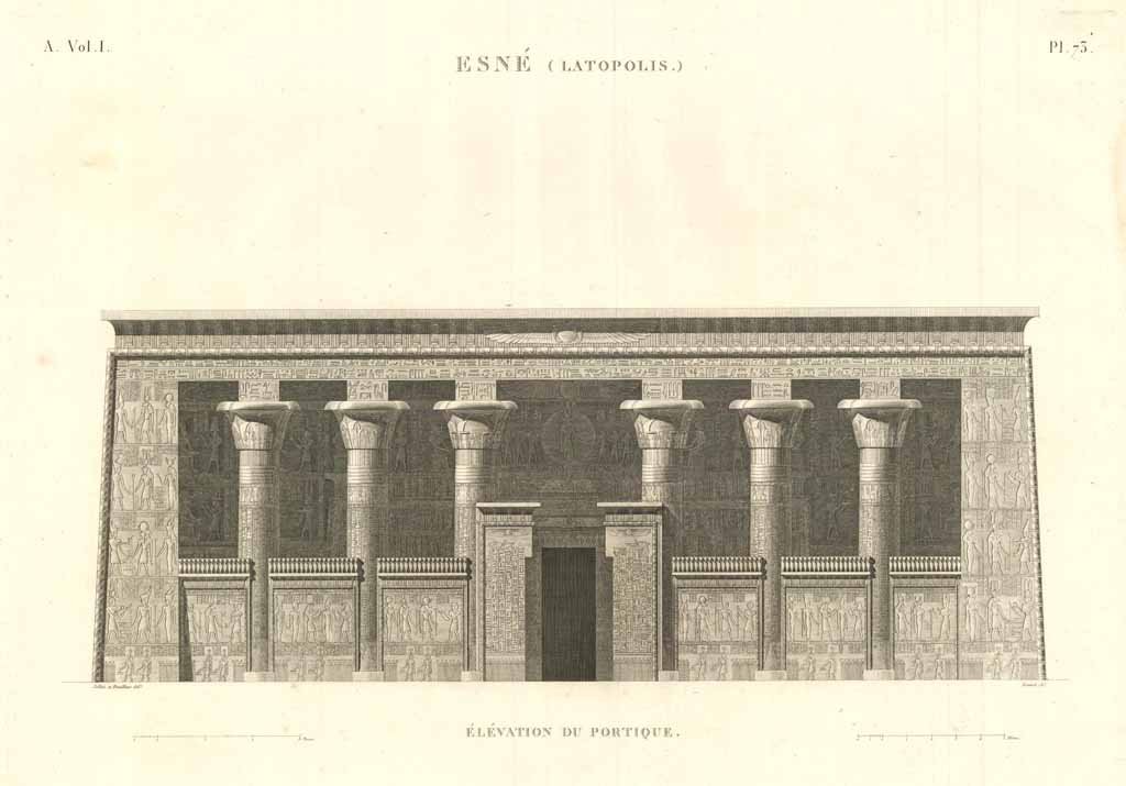 Maestosa facciata completamente decorata del Tempio di Khnum, divinità dalla testa d'ariete. In evidenza le colonne con capitelli ornati da motivi vegetali. Incisione all’acquaforte su lastra di rame, inserita nella monumentale opera Description de l’Egypte, II° edizione dal 1820-29 voluta da Luigi XVIII, importante risultato culturale dell’occupazione francese in Egitto per il periodo che va dal 1798 al 1801. Bonaparte decise di invadere queste terre per controllare le vie commerciali verso l’india ed assestare in questo modo un duro colpo all’economia britannica. Durante questa operazione, il Nostro favorì l’attività di numerosi artisti, ingegneri, matematici e naturalisti per registrare e catalogare con estrema precisione le costruzioni e i monumenti egiziani nonché la flora e la fauna. Il risultato di questo immane sforzo, che per la pubblicazione coinvolse quasi duemila tra artisti e tecnici oltre a quattrocento incisori, fu l’opera "Description de l’Egypte, ou recueil des observations et des recherches qui ont été faites en Egypte pendant l’expédition de l’armée française", che offre una globale visione scientifica dell’antico e moderno Egitto, nonché la sua storia naturale. La Description ebbe grande influenza sul movimento orientalista pittorico dell’ottocento e diede un contributo fondamentale alla diffusione dell’Egittologia. Numerosi edifici rappresentati in queste tavole sono stati completamente distrutti nel tempo.