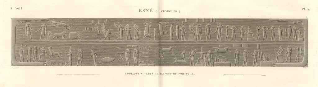 Lo zodiaco scolpito sul soffitto del portico del Tempio di Khnum, a Esna. Incisione all’acquaforte su lastra di rame, inserita nella monumentale opera Description de l’Egypte, II° edizione dal 1820-29 voluta da Luigi XVIII, importante risultato culturale dell’occupazione francese in Egitto per il periodo che va dal 1798 al 1801. Bonaparte decise di invadere queste terre per controllare le vie commerciali verso l’india ed assestare in questo modo un duro colpo all’economia britannica. Durante questa operazione, il Nostro favorì l’attività di numerosi artisti, ingegneri, matematici e naturalisti per registrare e catalogare con estrema precisione le costruzioni e i monumenti egiziani nonché la flora e la fauna. Il risultato di questo immane sforzo, che per la pubblicazione coinvolse quasi duemila tra artisti e tecnici oltre a quattrocento incisori, fu l’opera "Description de l’Egypte, ou recueil des observations et des recherches qui ont été faites en Egypte pendant l’expédition de l’armée française", che offre una globale visione scientifica dell’antico e moderno Egitto, nonché la sua storia naturale. La Description ebbe grande influenza sul movimento orientalista pittorico dell’ottocento e diede un contributo fondamentale alla diffusione dell’Egittologia. Numerosi edifici rappresentati in queste tavole sono stati completamente distrutti nel tempo. Piega editoriale.