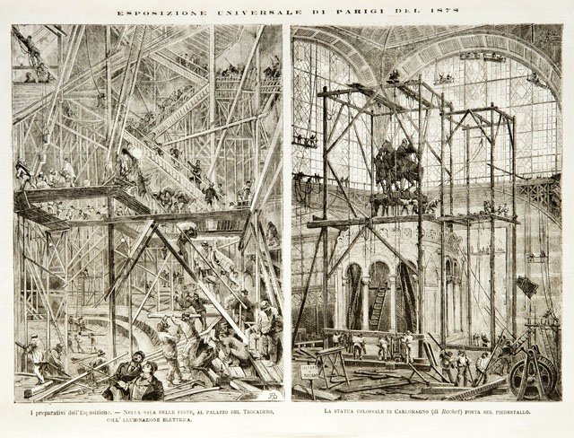 Esposizione Universale di Parigi del 1878 / I preparativi dell’Esposizione. Nella sala delle feste, al palazzo del Trocadero, coll’illuminazione elettrica.- La statua colossale di Carlomagno posta sul piedestallo