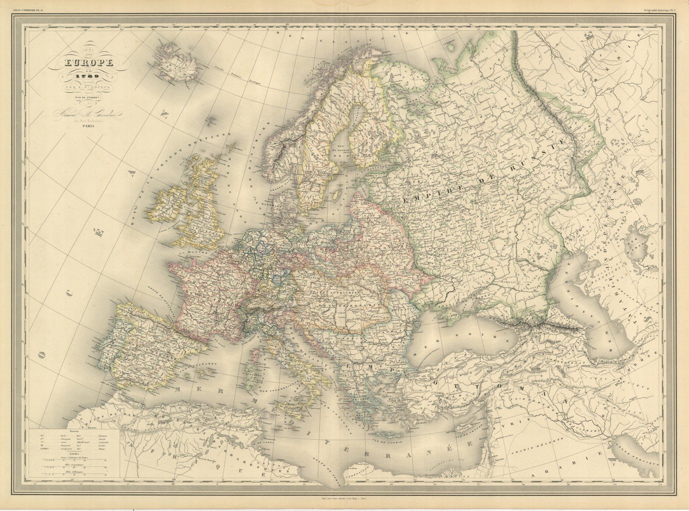 Carta geografica, antica ed originale, con coloritura coeva ai confini. Mappa inserita nell'opera "Atlas Universel Physique, Historique et Politique de Géographie Ancienne et Moderne. composé et dressé par H. Dufour gravé sur acier par Ch. Dyonnet" edita a Parigi dagli editori Paulin e Le Chevalier nel 1860. Autore: Dufour scrisse & Ch. Dyonnet inc. Luogo: Europa. Anno: 1860. Tecnica: incisione in acciaio. Dimensioni: 550x760 (585x813 mm il foglio).