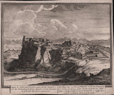 Bella veduta della fortezza di Verrua Savoia, tratta dal famoso atlante di città di Schenk, denominato Hecatompolis, stampato ad Amsterdam nel 1702. Durante la Guerra dei Trent’anni, che vede i Savoia alleati ai francesi contro spagnoli e austriaci, la fortezza di Verrua sostiene un grande assedio nel 1625. Agli inizi di agosto, il duca di Feria, governatore di Milano, e il capitano don Ponzalo de Cordoba giungono forti di 25.000 fanti, 5.000 cavalieri e 20 cannoni. A dispetto dei tre giorni che il duca reputa sufficienti per risolvere l’assedio, l’esercito imperiale attacca per tre mesi bombardando quotidianamente. Il 17 novembre avviene la ritirata con un numero di vittime vicino ai 10.000 uomini. A seguito della valorosa resistenza, Verrua si guadagna la fama di “Exigua et celeberrima”. ' Incisione su rame, in ottimo stato di conservazione. This is a rare view from Schenk's important town atlas, called Hecatompolis, sive Totius orbis Terrarum Oppida Nobiliora Centum; exquisite collecta atque eleganter depicta. The view recognizes as a source the contemporary French production (Aveline, Chereau le Jeune, Carel Allard) which in turn is based on the prototype of Braun and Hogenberg; however, it is personalized by an effective and accurate graphic rendering, attributable to the expert hand of an engraver of Peter Schenk's workshop. Below, the title is in Dutch and Latin and you can read also the name of the publisher. The exemplar has produced numerous subsidiaries throughout the eighteenth century and beyond, so it can also be considered a prototype. Peter Schenk (Elberfeld 1645 - 1715), a well-known Dutch engraver and publisher, was a pupil of Gerard Valck in Amsterdam, married his daughter and together with him bought many slabs of the Blaeu company in 1683. He produced various atlases and collections of plants and city views, for which he engraved many new maps: at the beginning of the eighteenth century he was appointed court engraver by Augustus of Saxony, he produced many portraits of famous people, many engravings from his printing house, which in the meantime had expanded considerably and housed the best engravers of the time, bear his signature only as a publisher. At his death the activity was continued by his son Peter, called the Younger. ' Copperplate, good condition. Cfr.