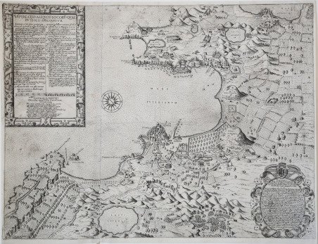 LA PRIMA RAPPRESENTAZIONE ACCURATA DEI CAMPI FLEGREI Nel cartiglio in basso a destra, con le armi del duca di Ossuna, si legge: ' ILLUSTRISS. Atque excellentiss. Principi Petro Giron Duci de Ossuna, Comiti de Vrena et, Proregi Neapoletano domino suo colendissimo Bartolomoeus Grassus Typographus Romanus S. P. D. Marius Cartharius, Maxime Princeps, Romanus civis atque de politioribus disciplinis benemeritus, cum superioribus diebus ageret Neapoli, id suae dilige[n]tiae industrioeque esse censuit si Puteolos veniens, quae ibi venerandae antiquitatis monimenta extant, curiose inquireret, observaret, delinearet, exprimeret. Urbem reversus, non ingratam Studiosis omnibus opera[m] se posuisse comperit. Nam cum antiquis recentibusque, bellor[um] direptionibus quassata toties misera[m] Italia[m] nostra[m], nullum fere sacrosanttae vetustatis xemplum habeamus sed ricinosa ta[n]tum quaedam rudera, lacera fragm.ta dirutas materias: in una illa Felicis Campaniae parte, nescio quo serva[n]te syncera integraque plurima conserva[n]tur. Addes, Princeps Generose, innumera illa quae illie visuntur Naturae miracula, exteris certe[m] hominibus porte[n]to sano stratibus etia[m] admira[n]da Ego igitur, (qui studia bonar[um] artium amo, et illaru[m] ama[n]tes ut iuve[m], quod possum continuo proesto) co[n]gita Cartharij dilige[n]tia, opere pretiu[m]duxi, si quaprimu[m] aeneis formis incisa in publicu[m] prodiret Sed nec hoc co[n]tentus novam Puteolis nostris illustratione[m] apparavi, relictis enim illis omnibus, in quibus sub hoc tempus typographica officina nostra desudabta, doctissimor[um] hominu[m] notas, quae veram Puteolanae antiquitatis ratione[m] edoreant, praelis commisi. Utrumque Princeps Illustrissime, tuo felicissimo nomini Sacrum esse patere, Hoc ut me, homine ignotum ad tantam celsituadinem in viam deducat, illud, ut in eiusdem perpetua[m] clientelam ac fide[m] conferat Vale Dux excele[n]tissime Romae IV Non Octob. M.D.LXXXIIII. Nel cartiglio in alto: ' EXPLICATIO ALIQUOT LOCORUM QUAE PUTEOLIS SPECTANTUR. Segue una legenda numerica di 20 rimandi ai luoghi notabili. Sempre nel cartiglio si legge: ' IULII ROSCII HORTINI DE rebus mirabilibus Puteolorum EPIGRAMMA Hic vires natura suas expressit, et auxit Ars opus. Eximius certat utrinque labor. Illa homines miserata cavis et rupibus undam Elicit, optatam qua trahat aeger opem. Ars veterum monimenta Virum, stagna, antra, lacusque, Ambarum claro tollit se gloria coelo. Quid magis obstupeat nescius hospes abit. Gloria sed maior surgit tibi candida Syren, quae gremio servas commoda tanta tuo. Orientazione fornita da una rosa dei venti nel mare, il nord-est in basso. Scala grafica di 100 miglia pari a mm 108. Opera priva di graduazione. “La mappa edita da Bartolomeo Grassi ed incisa da Mario Cartaro rappresenta il prototipo diretto di quasi tutte le cartografie dei Campi Flegrei fino alla metà del ‘700, quando, per i rinnovati interessi archeologici si rivisitarono quei luoghi con maggiore attenzione effettuando rilievi con nuove strumentazioni. È la prima carta archeologica dei Campi Flegrei, ricchissima di informazioni antiquarie e di grande utilità per la collocazione dei principali monumenti dell’area, sia di quelli ancora esistenti, sia delle antichità scomparse, la cui ubicazione è basata su fonti letterarie. L’opera riporta nella dedica la data del 4 ottobre 1584. Grassi ottenne il privilegio per la stampa il primo ottobre dello mstesso anno, unitamente a quello per un libro sulle antichità di Pozzuoli, illustrato da tavole incise sempre dal Cartaro” (cfr. S. Bifolco, F. Ronca, ' Cartografia e topografia italiana del XVI secolo, 2018: pp. 2068-2069, Tav. 1045) Sull’area dei Campi Flegrei in precedenza (1538) era stata stampata la celebre ' IL VERO DISEGNIO IN SUL PROPIO LUOGHO RITRATTO DEL INFELICE PAESE DI POSUOLO, ' del Maestro del Trabocchetto (B/R. Tav. 1044), ' una carta d’occasione per documentare il terremoto che aveva dato luce al Monte Nuovo, che però non delin. THE FIRST ACCURATE REPRESENTATION OF THE PHLEGRAEAN FIELDS In the lower cartouche: ILLUSTRISS. Atque excellentiss. Principi Petro Giron Duci de Ossuna, Comiti de Vrena et, Proregi Neapoletano domino suo colendissimo Bartolomoeus Grassus Typographus Romanus S. P. D. Marius Cartharius, Maxime Princeps, Romanus civis atque de politioribus disciplinis benemeritus, cum superioribus diebus ageret Neapoli, id suae dilige[n]tiae industrioeque esse censuit si Puteolos veniens, quae ibi venerandae antiquitatis monimenta extant, curiose inquireret, observaret, delinearet, exprimeret. Urbem reversus, non ingratam Studiosis omnibus opera[m] se posuisse comperit. Nam cum antiquis recentibusque, bellor[um] direptionibus quassata toties misera[m] Italia[m] nostra[m], nullum fere sacrosanttae vetustatis xemplum habeamus sed ricinosa ta[n]tum quaedam rudera, lacera fragm.ta dirutas materias: in una illa Felicis Campaniae parte, nescio quo serva[n]te syncera integraque plurima conserva[n]tur. Addes, Princeps Generose, innumera illa quae illie visuntur Naturae miracula, exteris certe[m] hominibus porte[n]to sano stratibus etia[m] admira[n]da Ego igitur, (qui studia bonar[um] artium amo, et illaru[m] ama[n]tes ut iuve[m], quod possum continuo proesto) co[n]gita Cartharij dilige[n]tia, opere pretiu[m]duxi, si quaprimu[m] aeneis formis incisa in publicu[m] prodiret Sed nec hoc co[n]tentus novam Puteolis nostris illustratione[m] apparavi, relictis enim illis omnibus, in quibus sub hoc tempus typographica officina nostra desudabta, doctissimor[um] hominu[m] notas, quae veram Puteolanae antiquitatis ratione[m] edoreant, praelis commisi. Utrumque Princeps Illustrissime, tuo felicissimo nomini Sacrum esse patere, Hoc ut me, homine ignotum ad tantam celsituadinem in viam deducat, illud, ut in eiusdem perpetua[m] clientelam ac fide[m] conferat Vale Dux excele[n]tissime Romae IV Non Octob. M.D.LXXXIIII. ' In the upper cartouche: EXPLICATIO ALIQUOT LOCORUM QUAE PUTEOLIS SPECTANTUR. This is fol