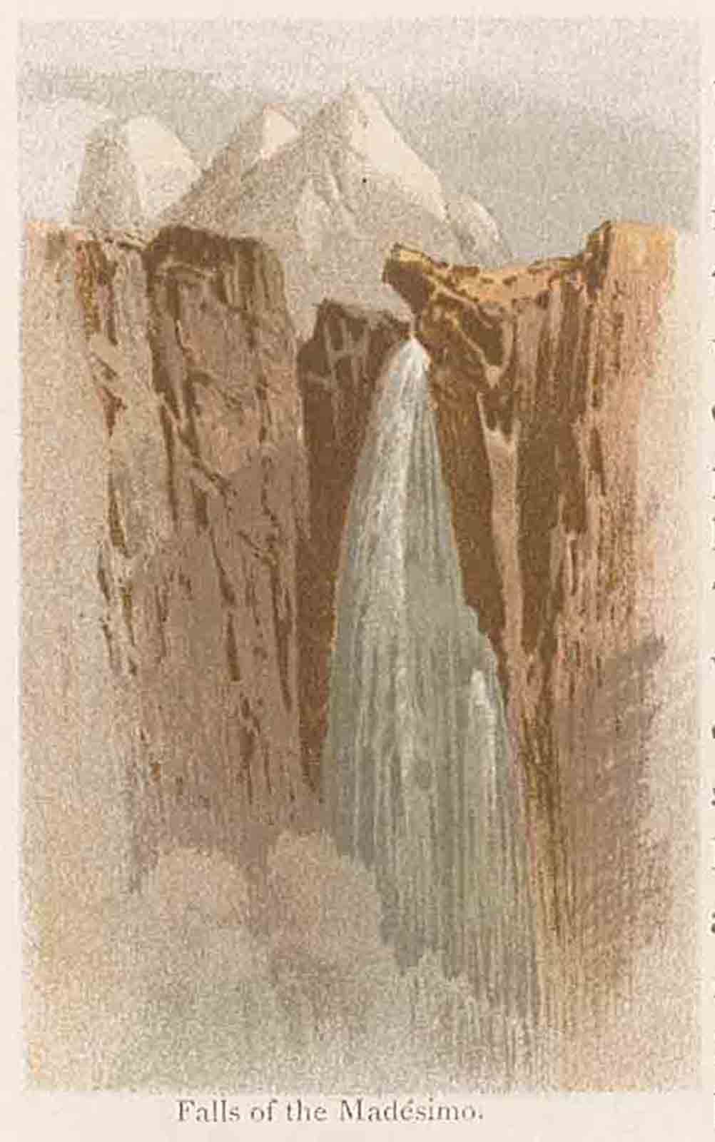 Piccola veduta dellle cascate di Madesimo, tratta dall'opera " Mountains and Lakes of Switzerland and Italy ". Valle adiacente alla Valtellina. Testo al retro