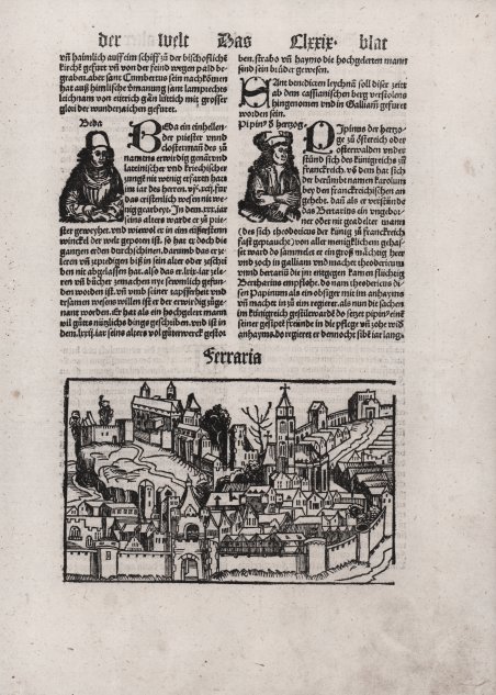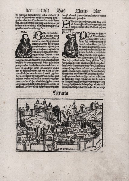 Veduta fantastica della città posta nella parte inferiore del foglio che contiene anche il teste descrittivo, tratto dal Liber cronicarum cum figuris et umaginibus ab initio mudi usus mit temporis rarissima edizione "tascabile" della celebre cronaca del mondo, edita ad Ausburg presso Johann Schonsperger, nel 1496.Prima edizione in tedesco dello Schonsperger. Egli abbrevia sia il testo sia il formato dello Schedel per produrre un edizione che fosse più maneggevole a commerciabile di quella di A. Koberger.Silografia, posta nella parte inferiore di un foglio di testo, in ottimo stato di conservazione. Rara. An imaginary view of the city, printed on the lower part of the sheet with the descriptive text, taken from Liber cronicarum cum figuris et umaginibus ab initio mudi usus mit temporis, a very rare "pocket" edition printed in Ausburg by Johann Schonsperger, in 1496.First German edition realized by Schonsperger. He cut both text and the size realized by Schedel to relize an edition that was to be more handy and saleable.Woodcut, printed in the central part of a double text sheet, minor repair on central fold, otherwise in good condition. Rare. Cfr.